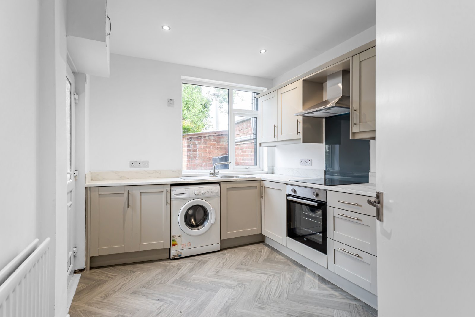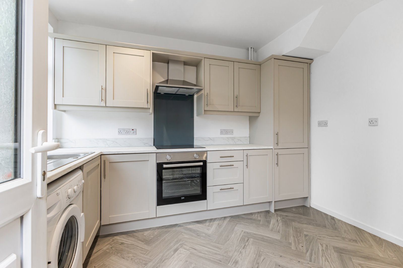 Single drainer stainless steel sink unit with mixer taps, excellent range of high and low level units with laminated work surfaces, built in oven and 4 ring ceramic hob, glass splash back, stainless steel chimney extractor fan, plumbed for washing machine, integrated fridge freezer, laminate wooden floor, uPVC double glazed door to rear garden.