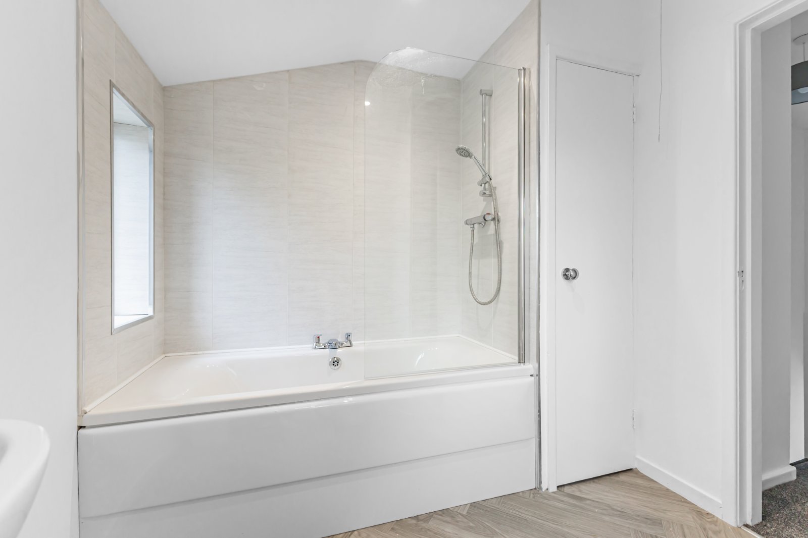 White suite comprising: Panelled bath with mixer taps and thermostatically controlled shower, dual flush WC pedestal wash hand basin, part panelled walls, heated towel rail, recessed spotlights, hot press with storage above.
