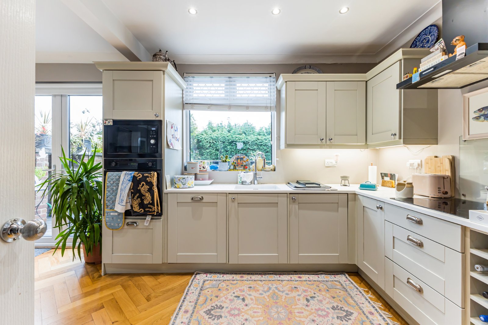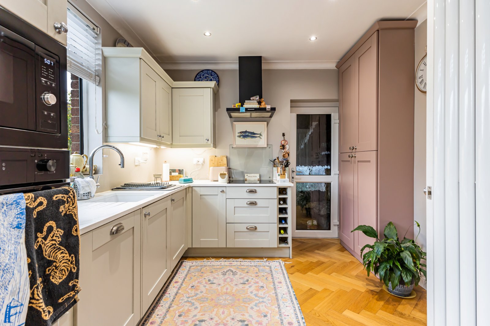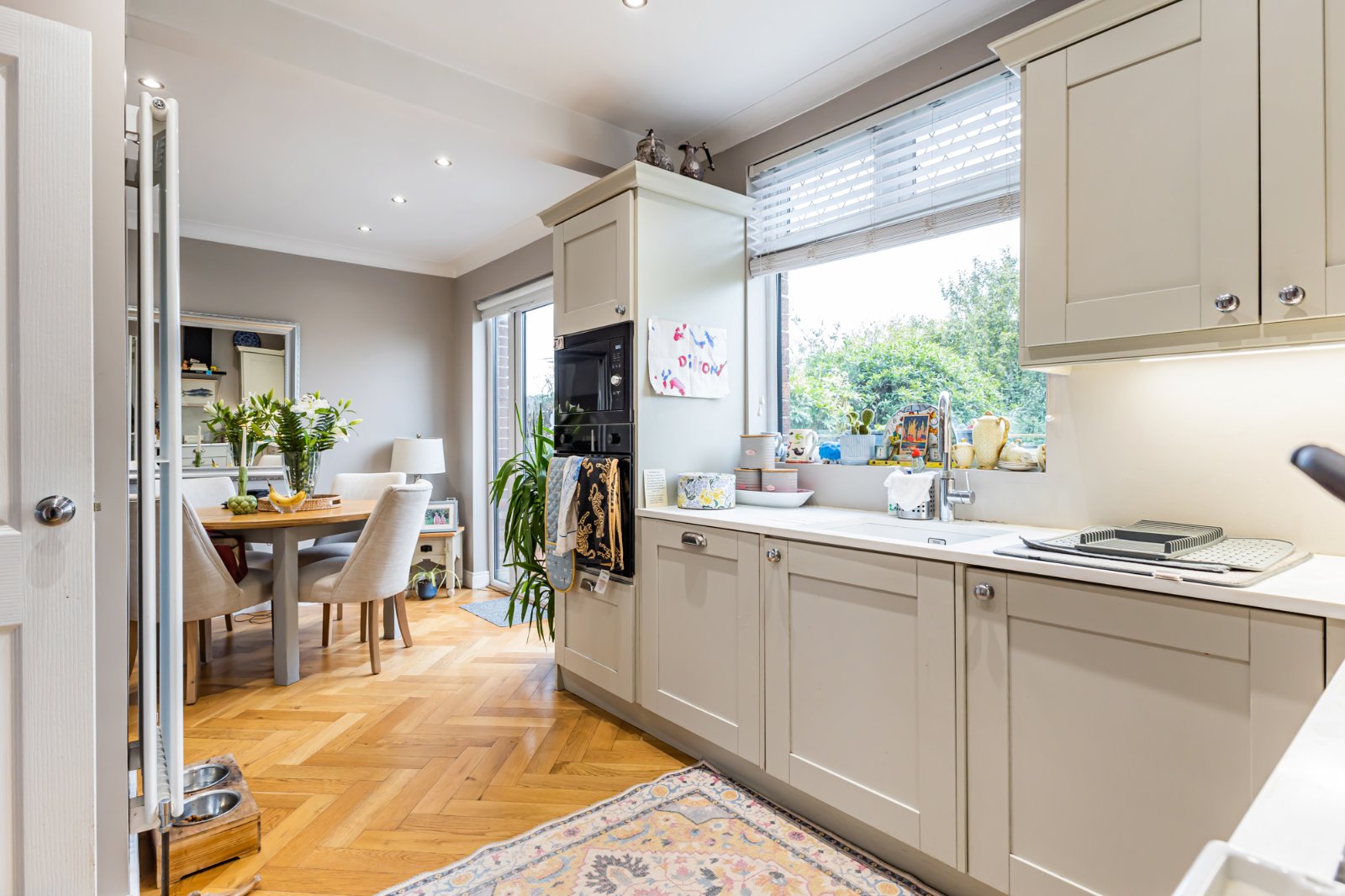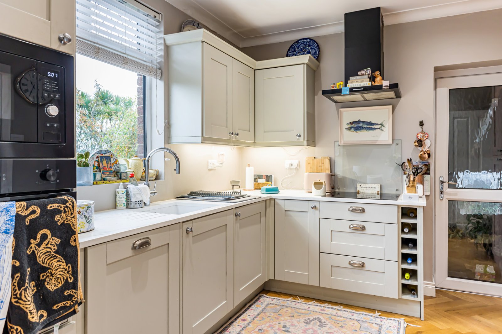 Franke inset Composite sink unit with Quooker hot water tap, excellent range of high and low level units with stone worktops, built in oven and 4 ring induction hob, glass splash back, integrated dishwasher, microwave and fridge, recessed spotlights, uPVC double glazed door to attached garage.