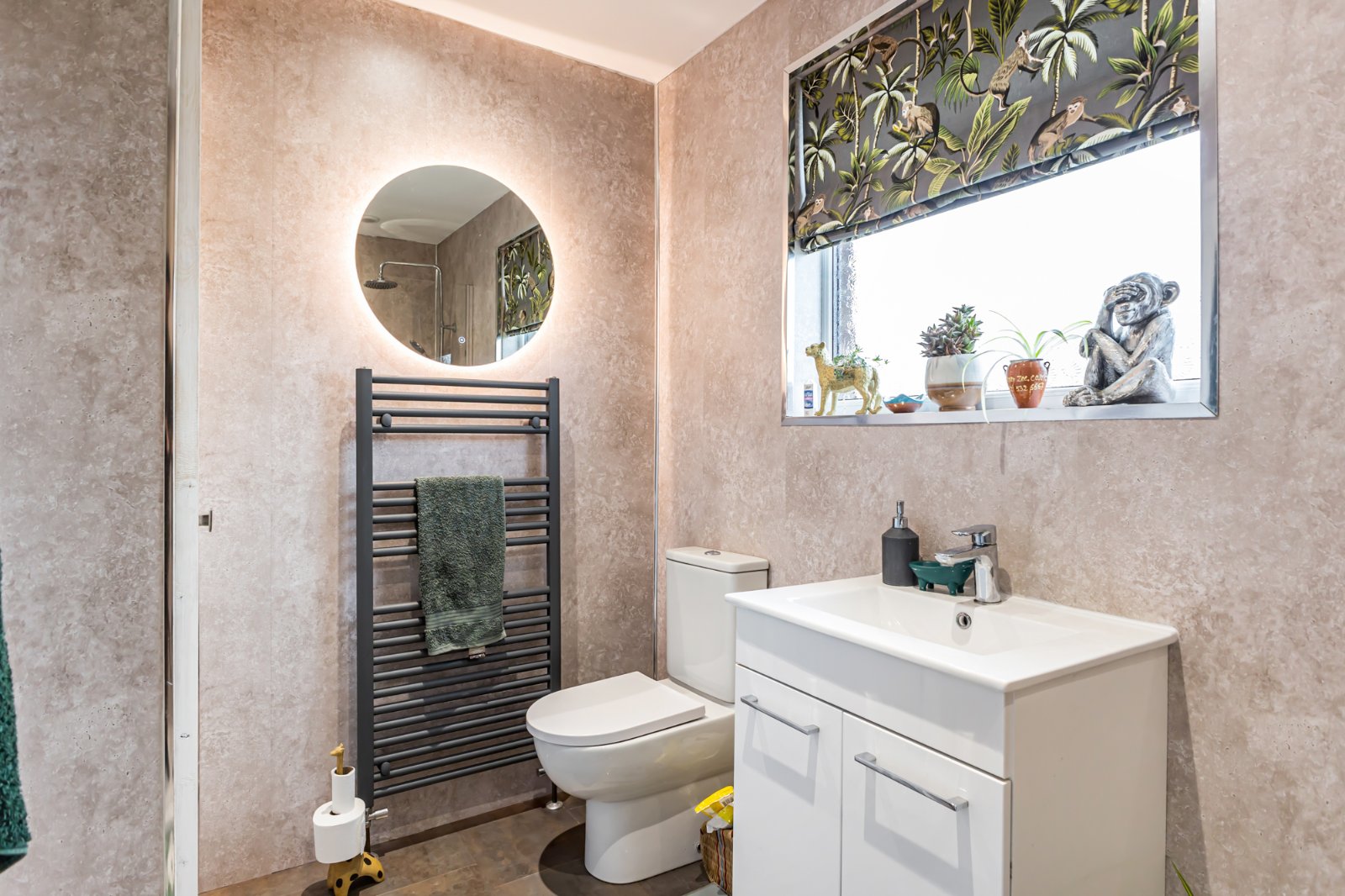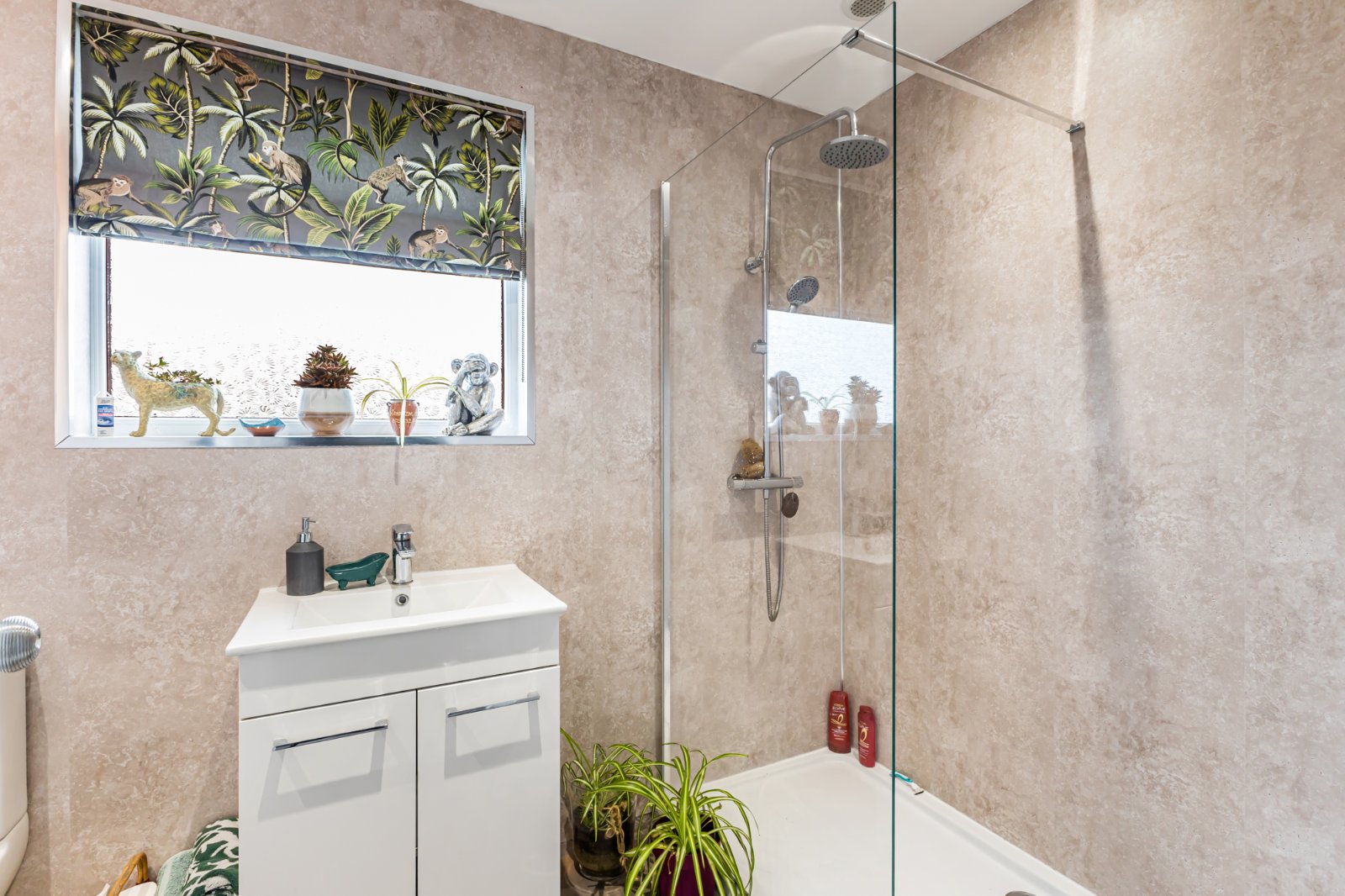 Luxury white suite comprising: Walk in shower with panelled walls, thermostatically controlled shower and Rain shower, Vanity unit with mixer taps, dual flush WC, heated towel rail, laminate tile effect floor and recessed spotlights.