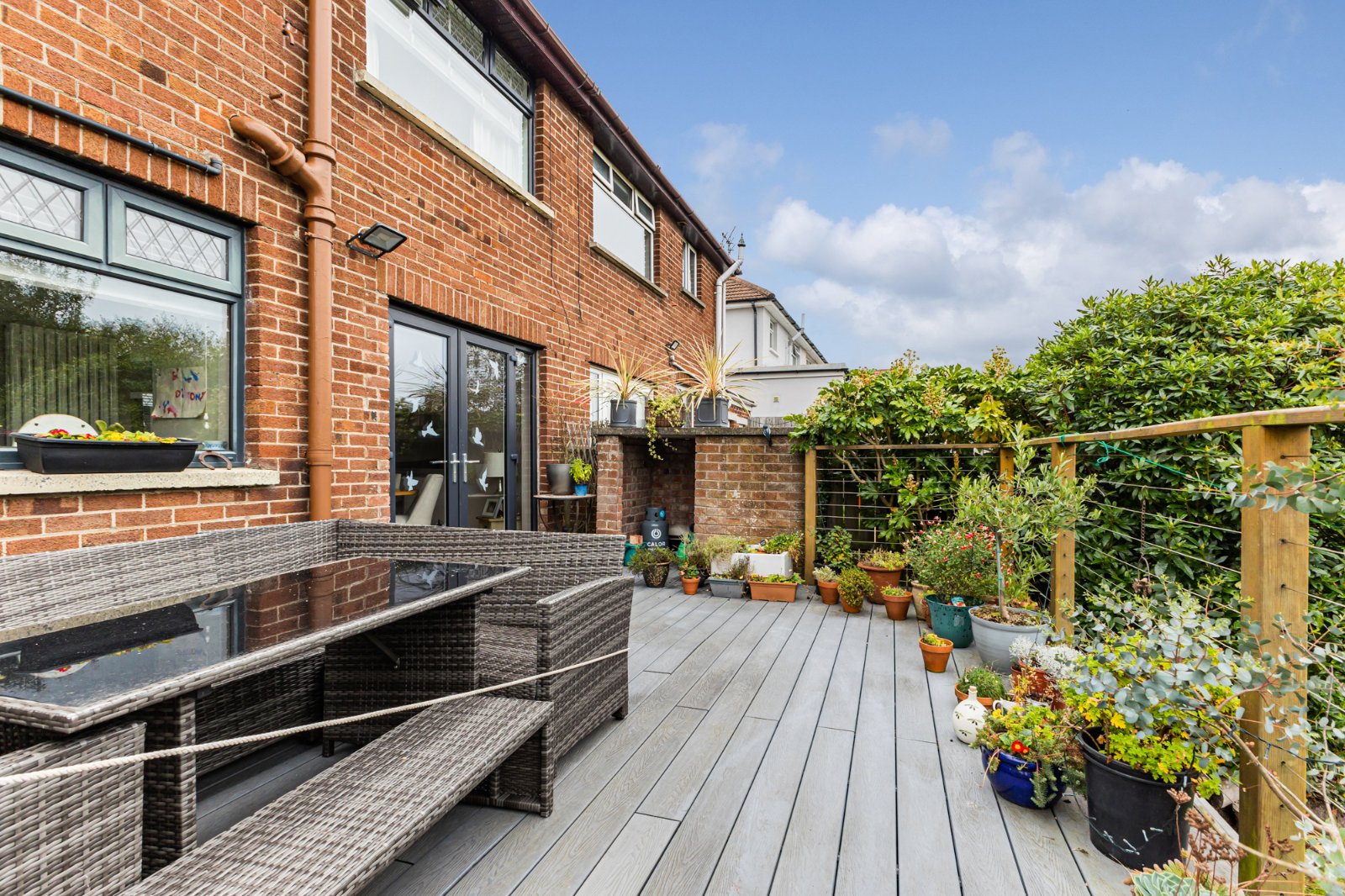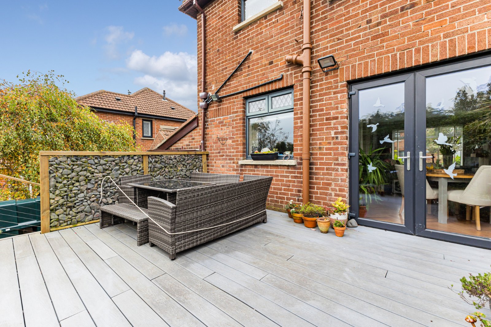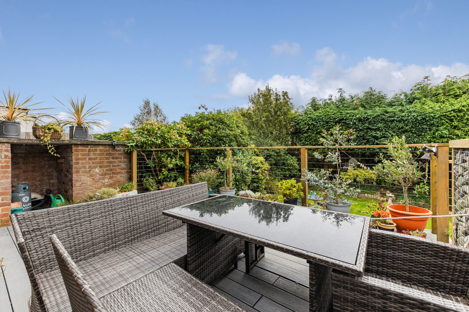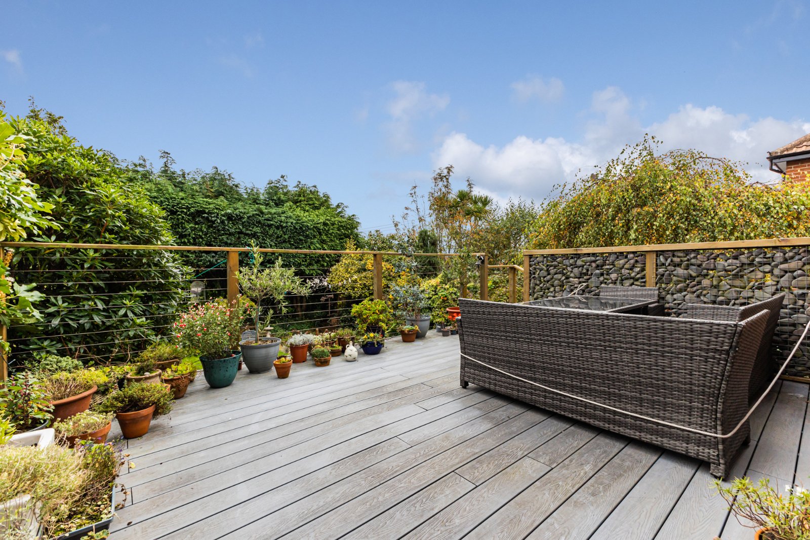 Enclosed south facing rear garden in lawns , shrubs and boundary hedging. Feature raised composite deck accessed directly from the kitchen / dining.