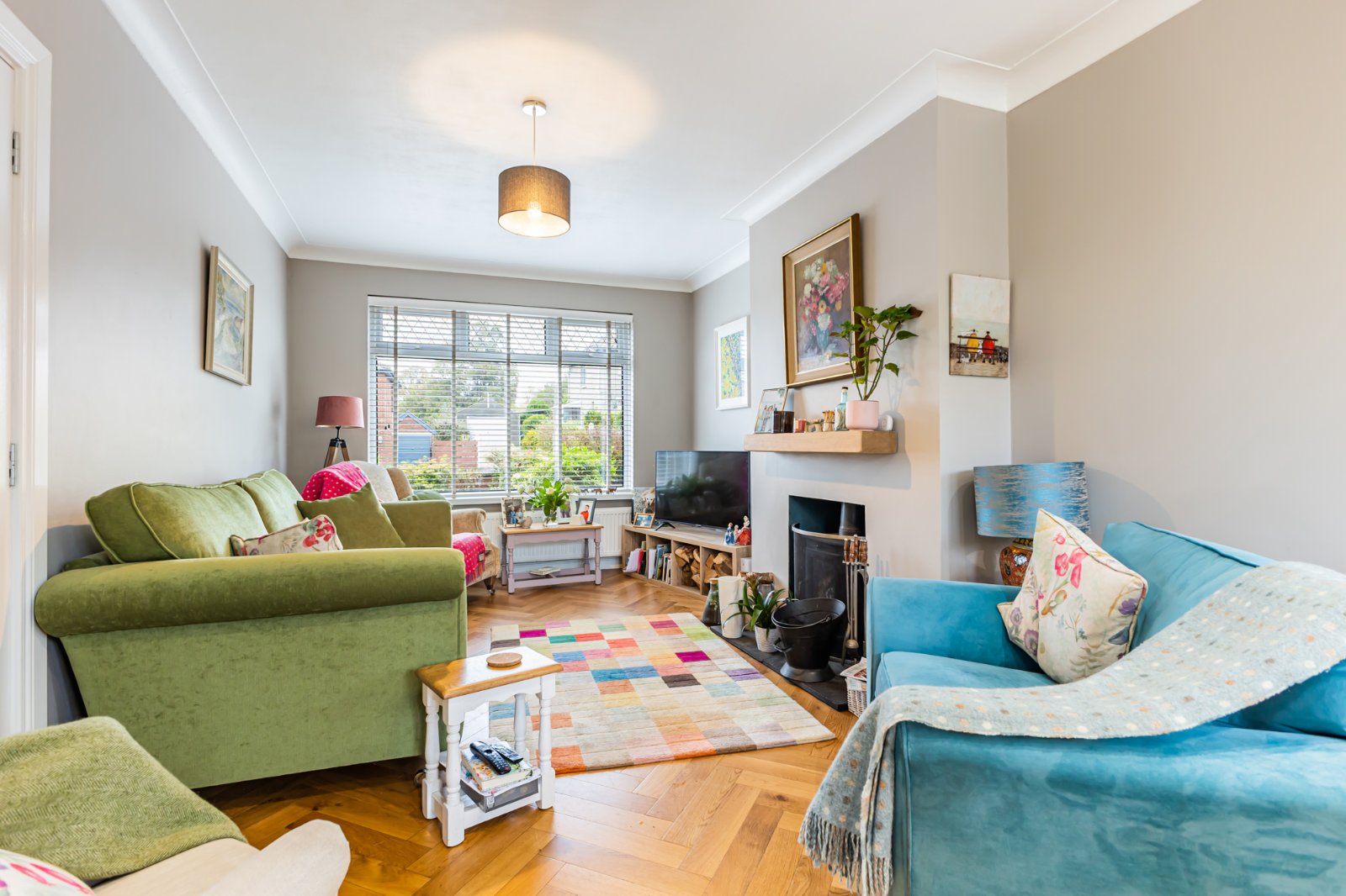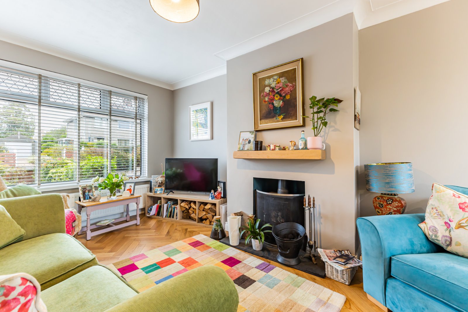 Herringbone engineered oak floor, Feature multi fuel stove with slate hearth. Open plan to Kitchen / Dining.