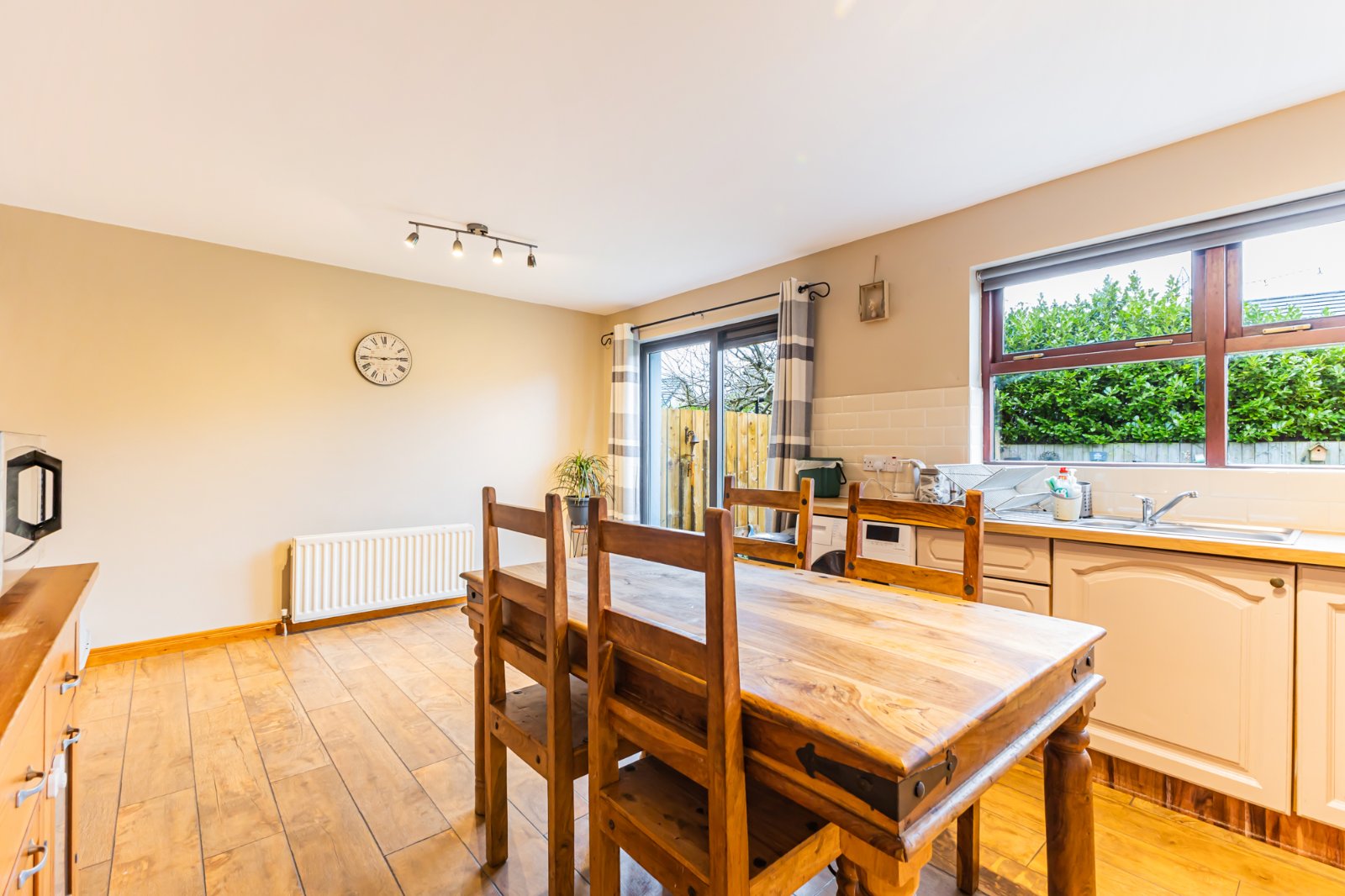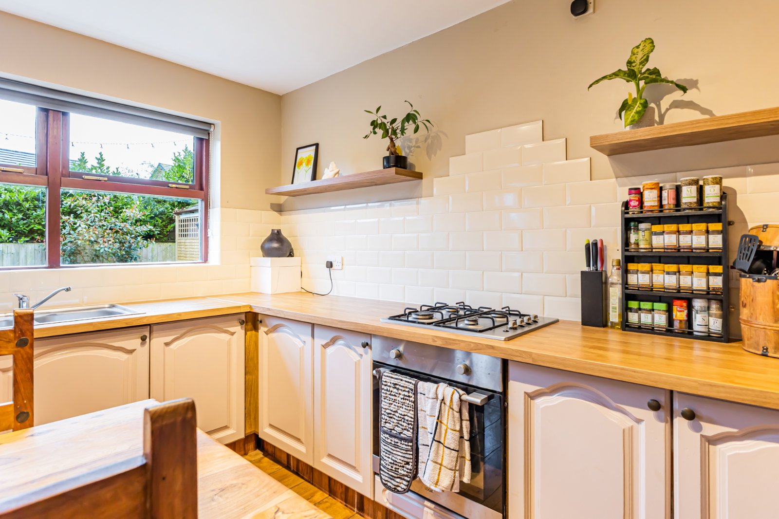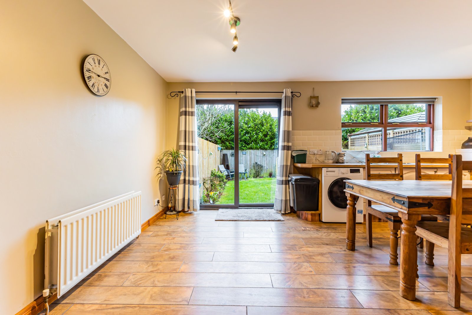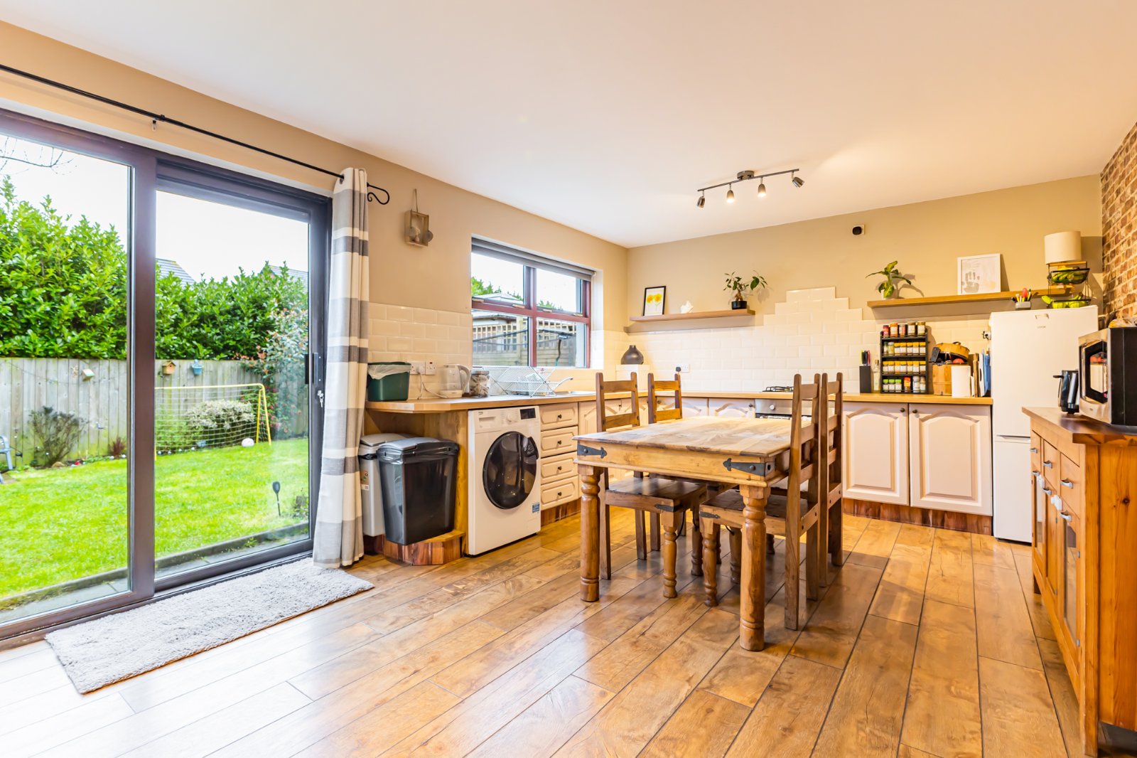Single drainer 1.5 stainless steel sink unit with mixer taps, laminate work surfaces, excellent range of low level units, built in oven, 4 ring gas hob, plumbed for washing machine, laminate wooden floor, partly tiled walls, dining area, aluminum double glazed sliding door to garden.