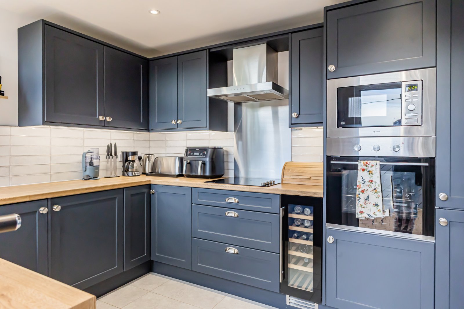 Single drainer 1.5 composite sink unit with mixer taps, excellent range of high and low level units with laminated work surfaces, built in oven and 4 ring ceramic hob, stainless steel splash back and chimney extractor fan, integrated microwave and wine fridge, integrated fridge freezer, integrated dishwasher, part tiled walls, recessed spotlights, ceramic tiled floor, uPVC double glazed door to garden.