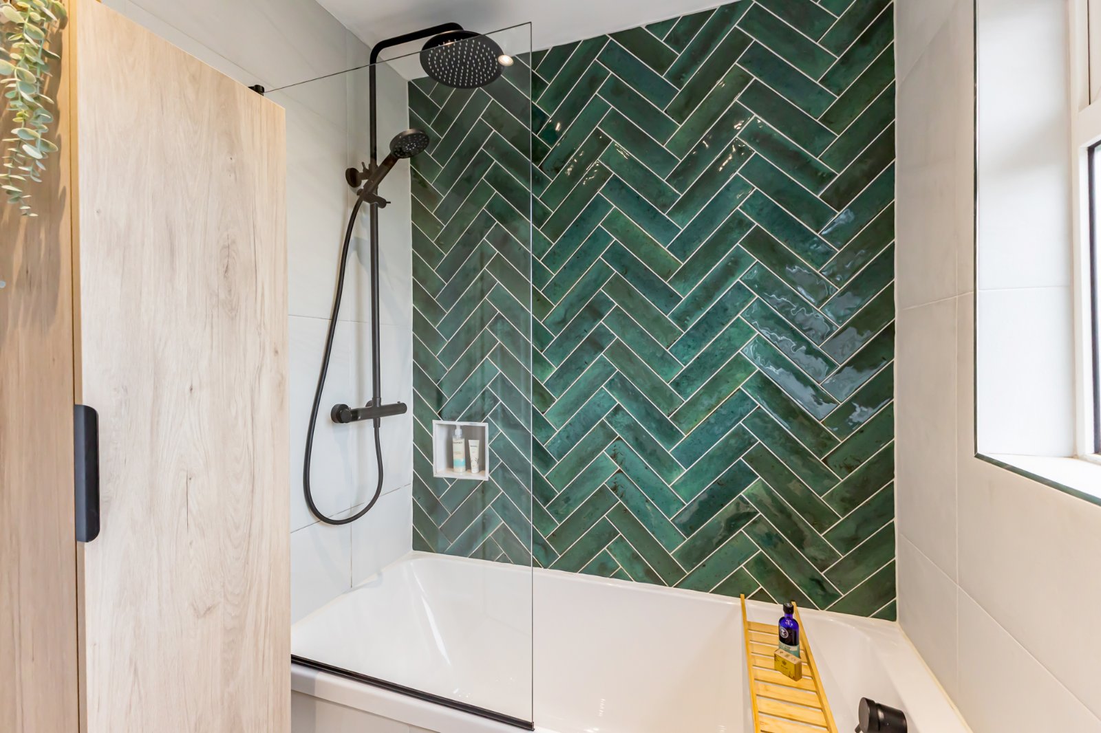 Modern white suite comprising: Panelled bath with thermostatically controlled shower and additional Rain shower, dual flush WC, vanity unit with mixer taps, fully tiled walls, ceramic tiled floor, heated towel rail, recessed spotlights and extractor fan.