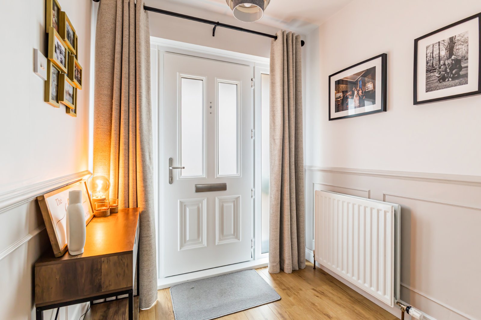 Composite double glazed front door, laminate wooden floor, feature panelled walls.