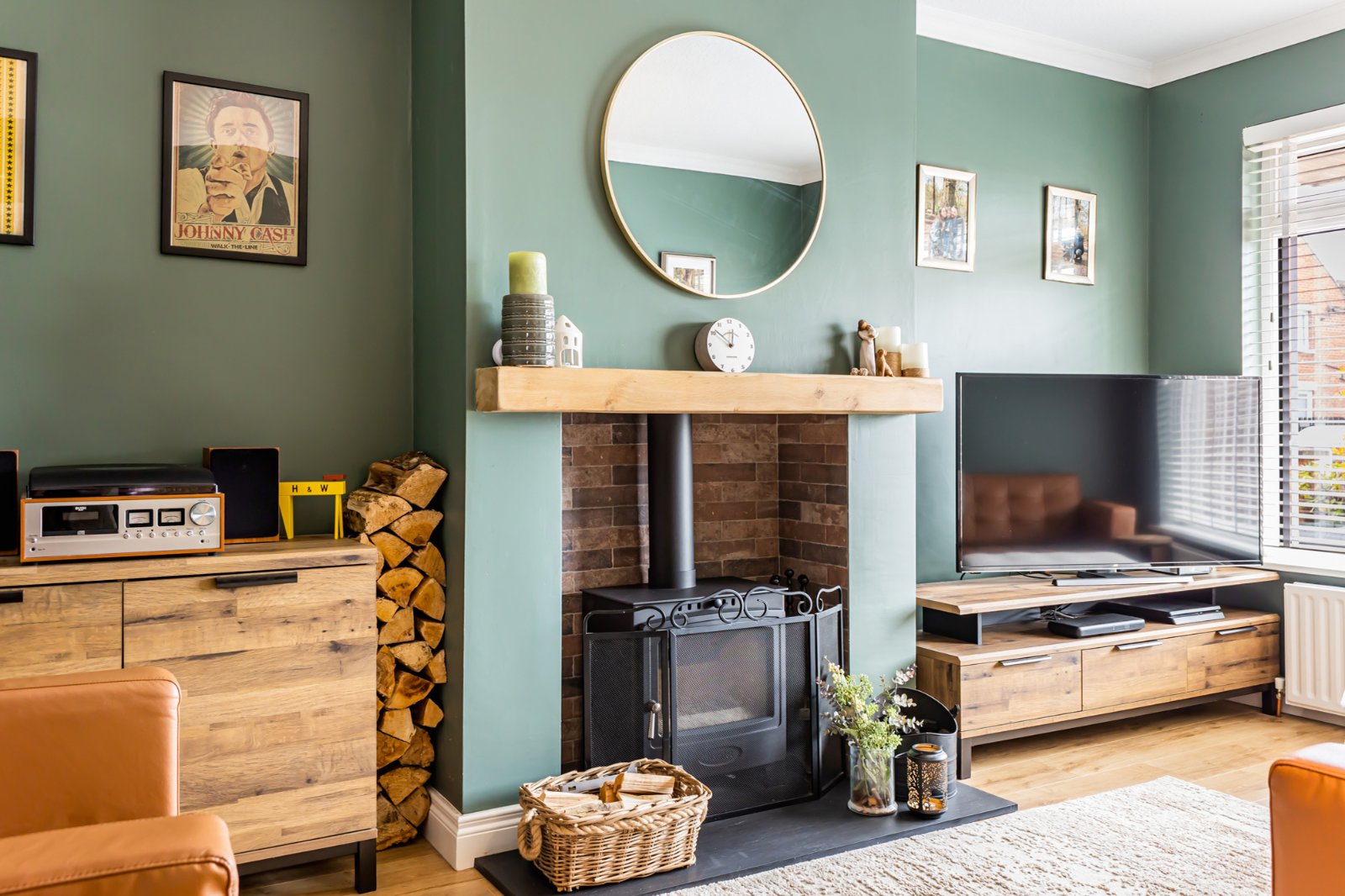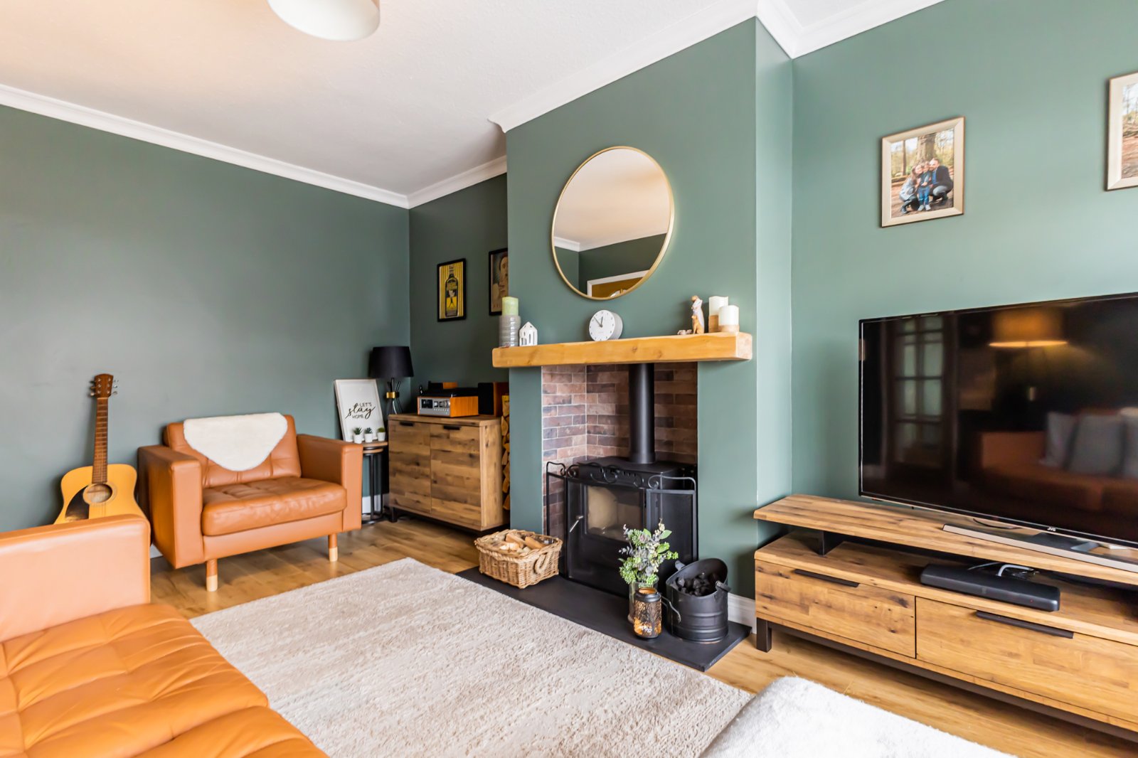 Laminate wooden floor, cornice ceiling, Feature Multi Fuel Stove with slate hearth.