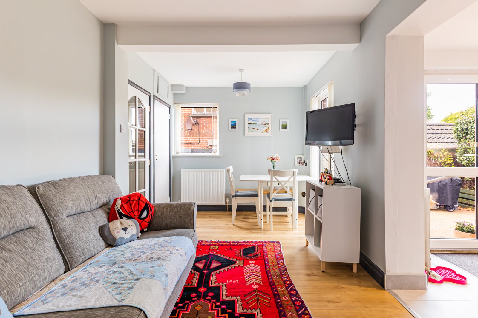 Laminate wooden floor, under stairs storage, open plan to extended kitchen.