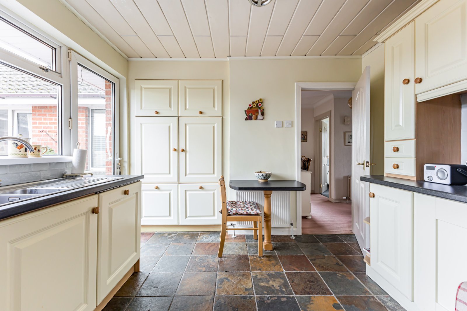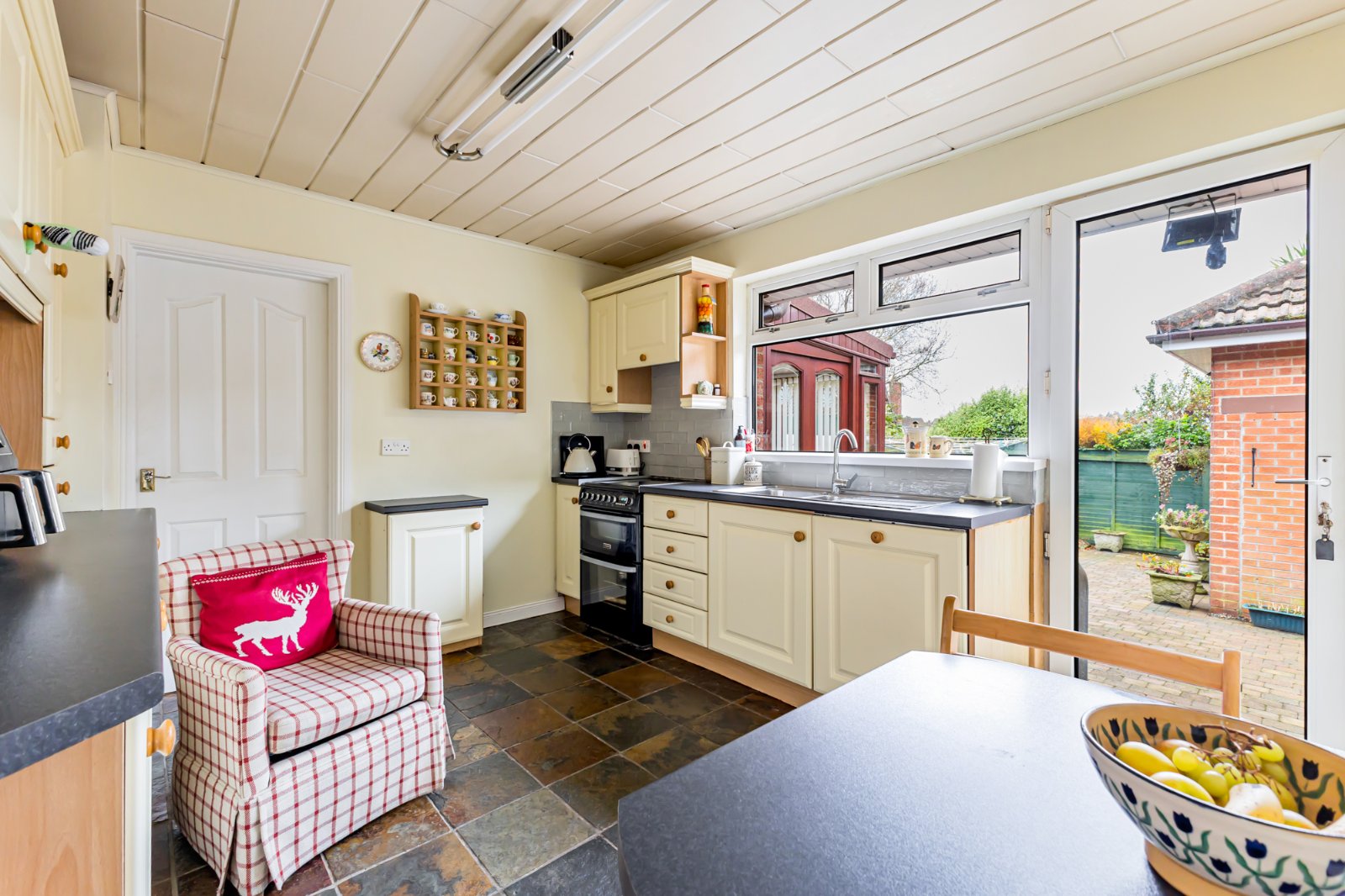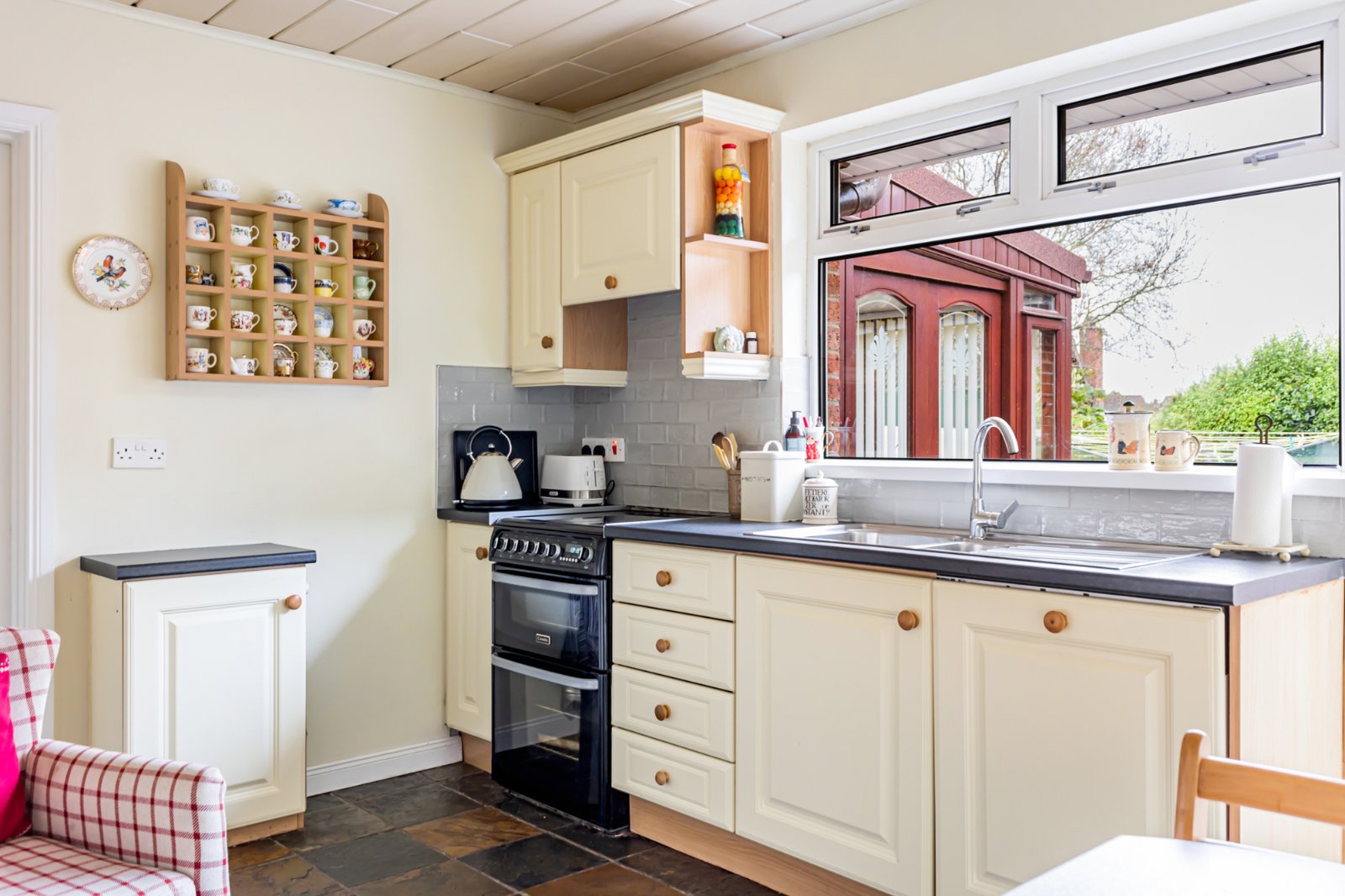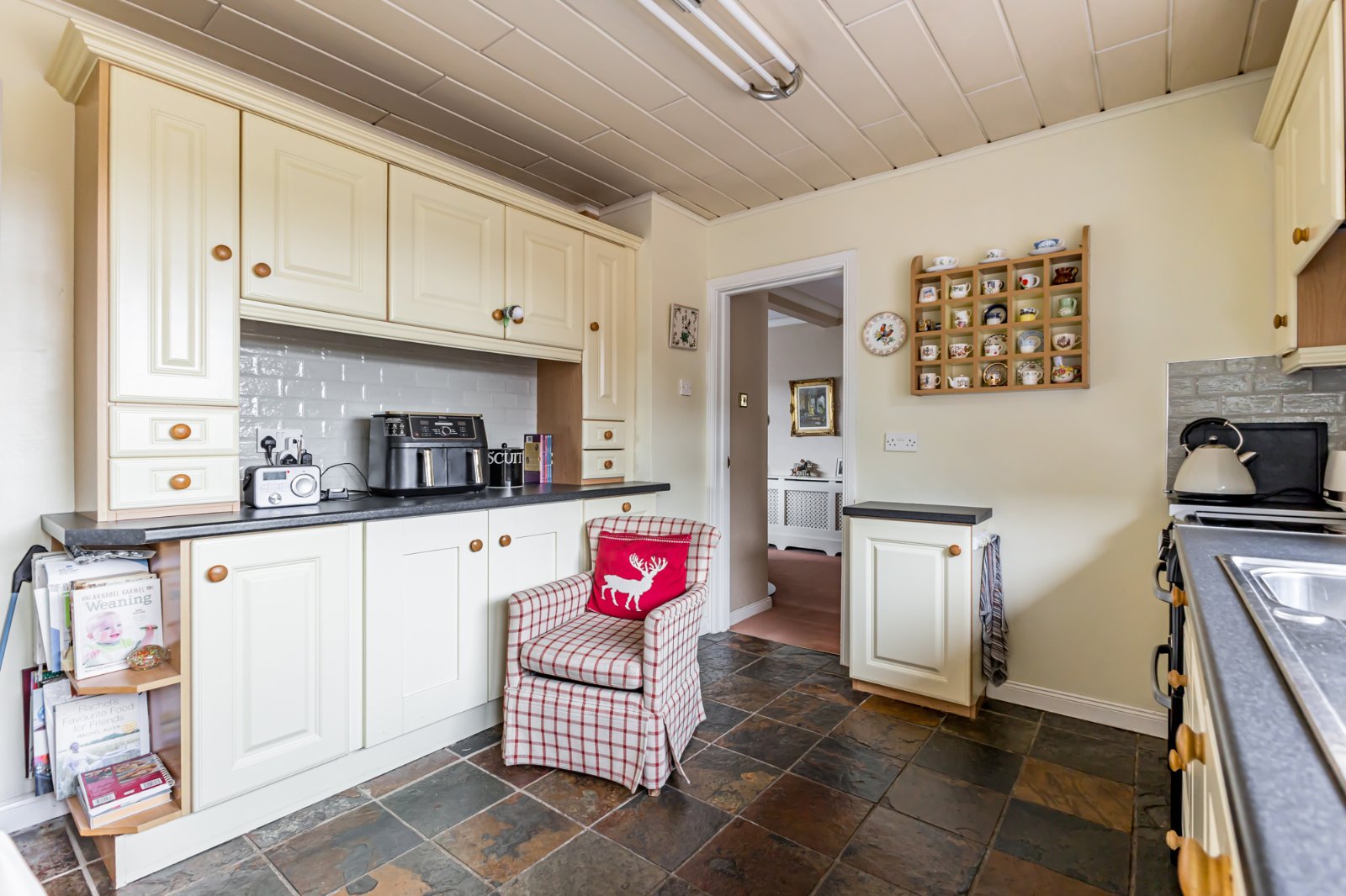 Single drainer 1.5 stainless steel sink unit with mixer taps, excellent range of high and low level units with laminated work surfaces, cooker space, extractor fan and canopy, part tiled walls, Chinese slate floor, integrated dishwasher and fridge, breakfast bar, uPVC double glazed door to rear garden.