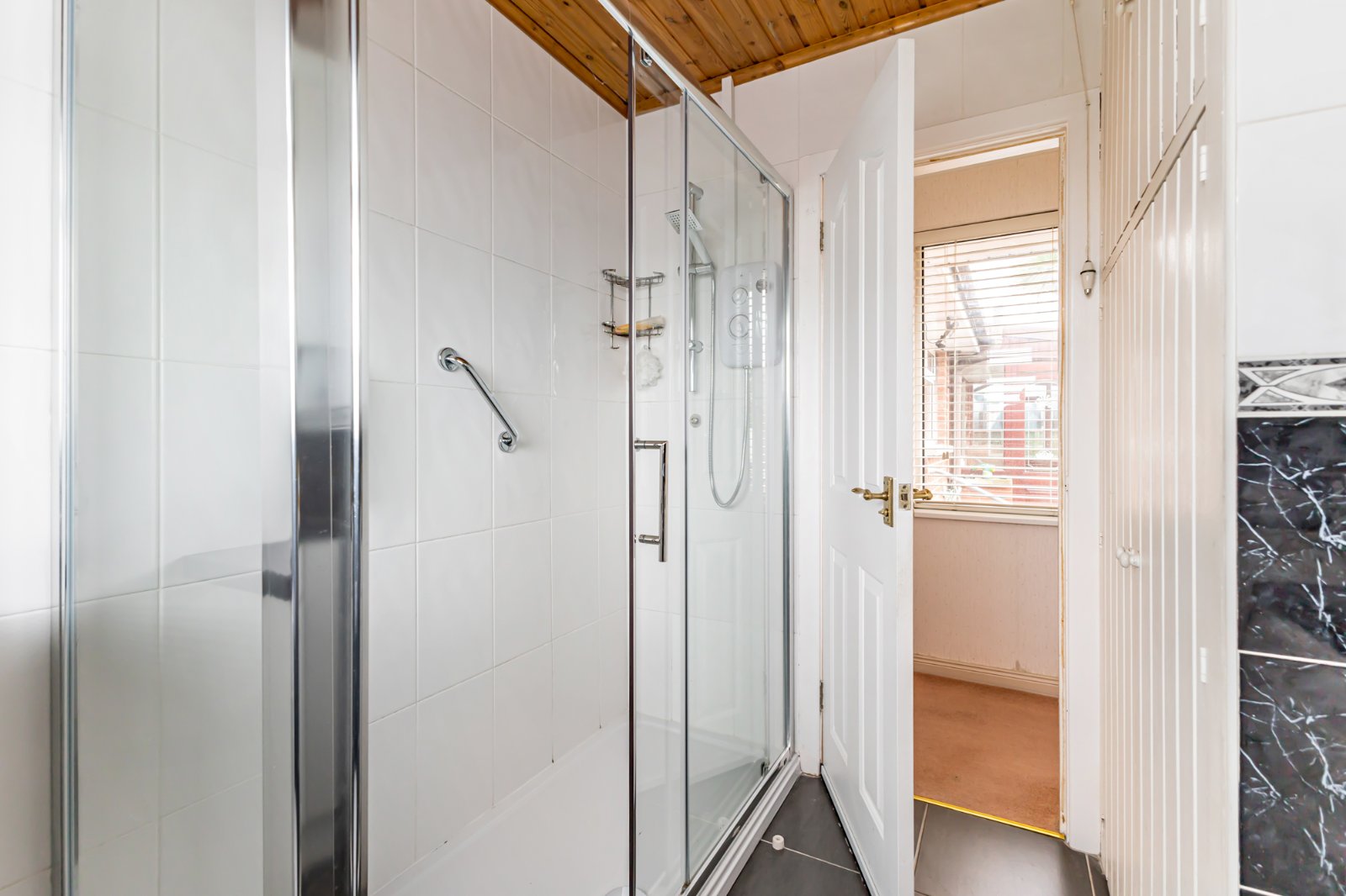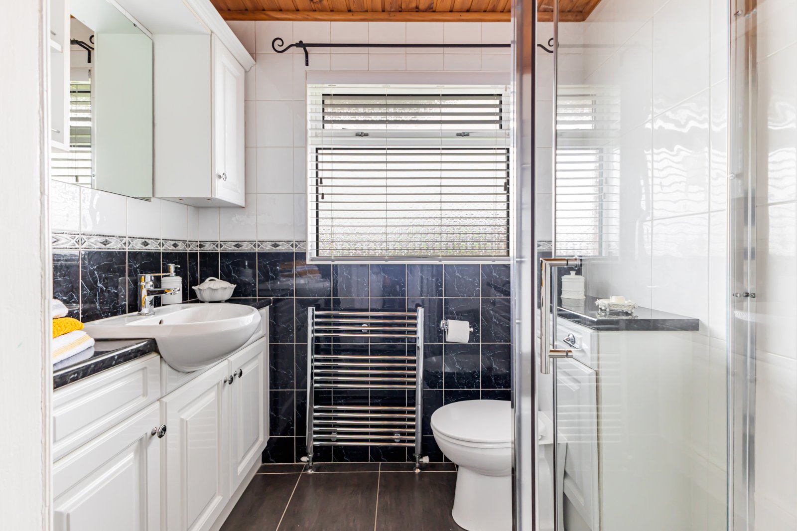 Modern white suite comprising: Fully tiled walk in shower cubicle with Mira Jump shower unit, concealed cistern low flush WC, vanity unit with mixer taps and additional storage, fully tiled walls, ceramic tiled floor, heated towel rail. Gas boiler and Airting cupboard.