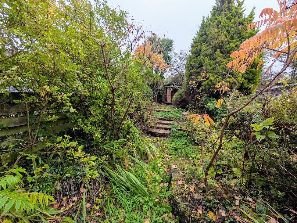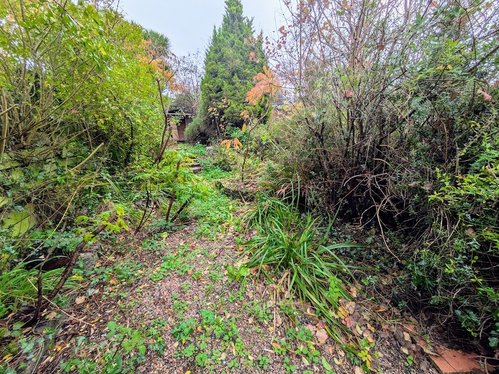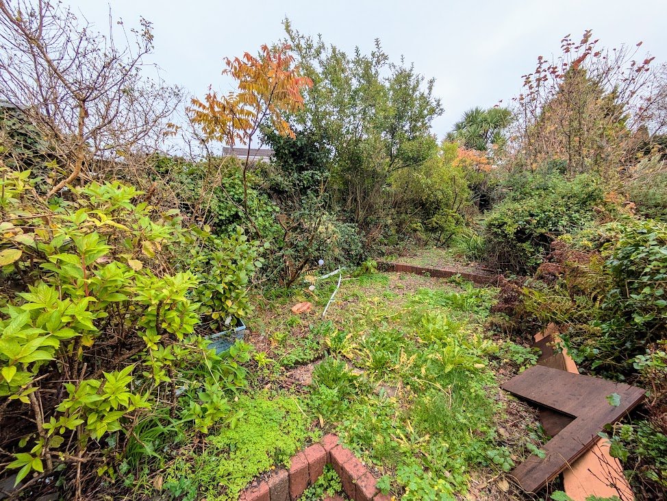 Front garden in loose pebbles and shrubs, potential car parking space.