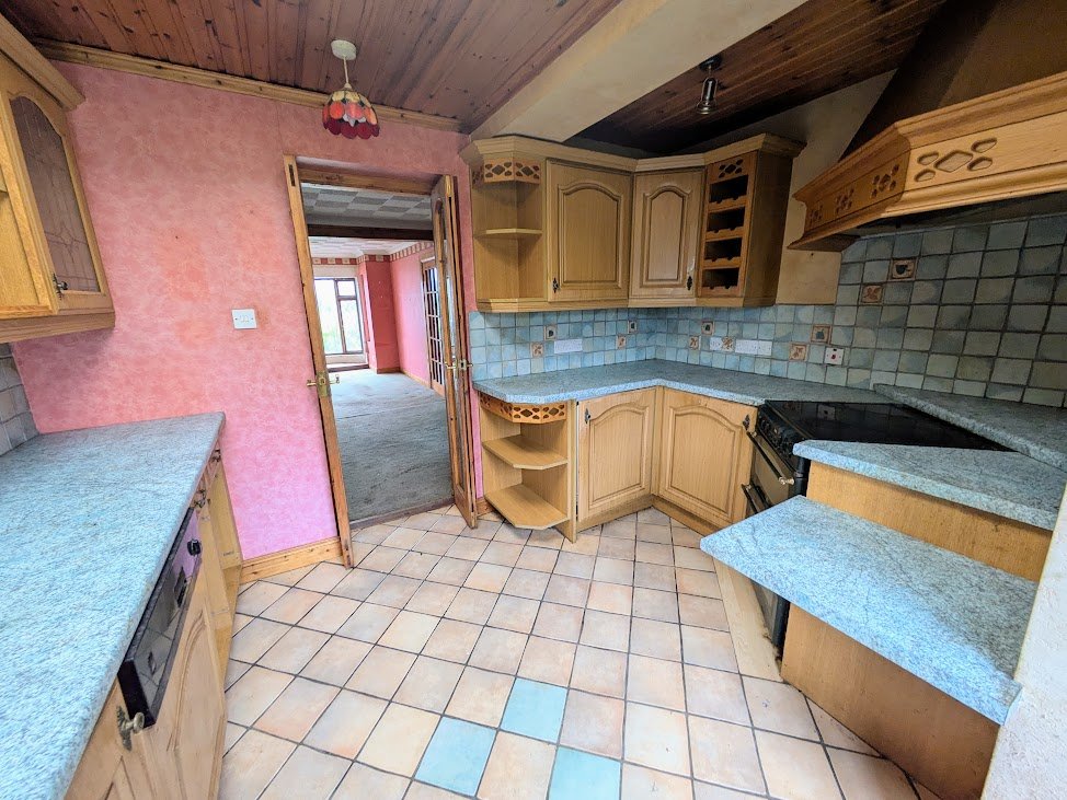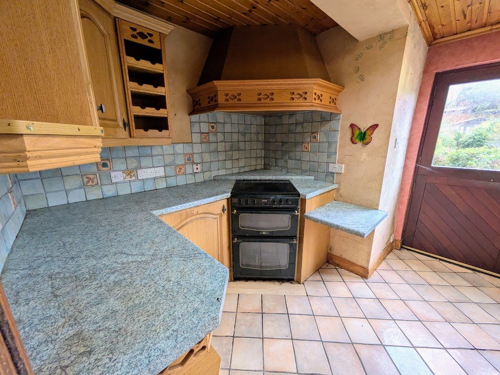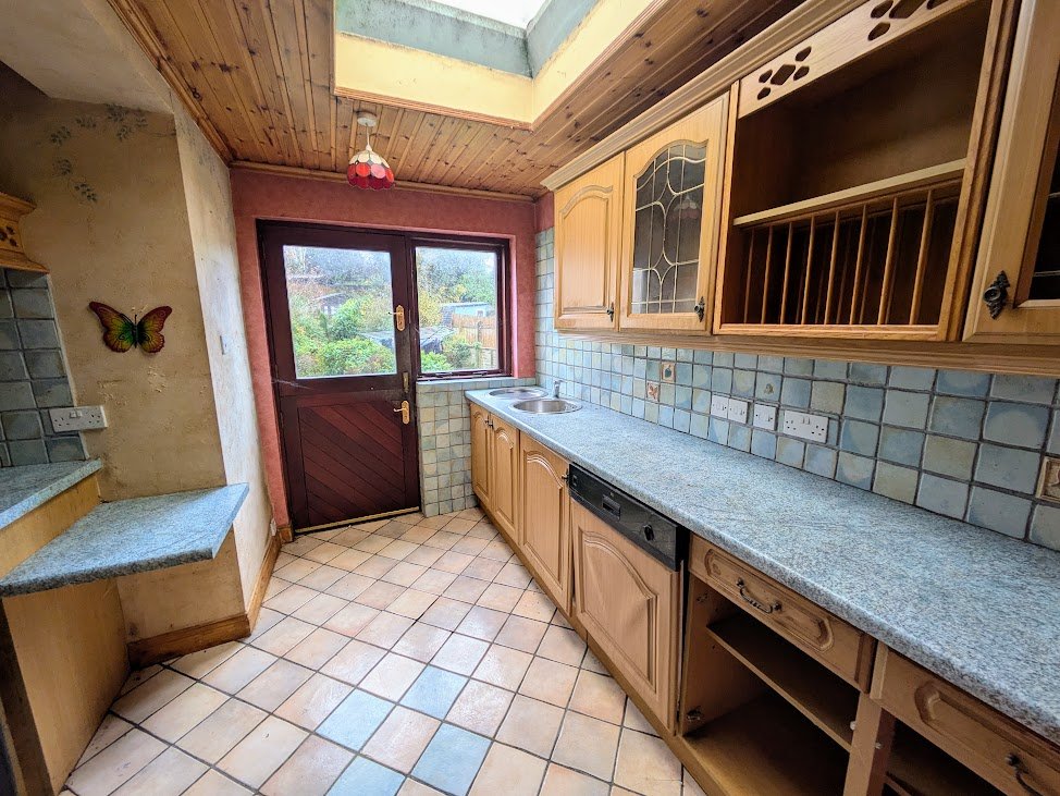 Stainless steel sink unit, laminate work surfaces, cooker space,fully tiled walls, ceramic tiled floor, tongue and groove ceiling, roof light, hard wood door to garden.