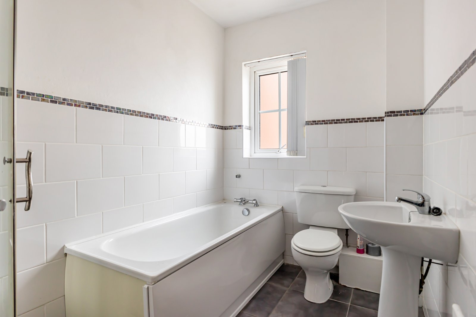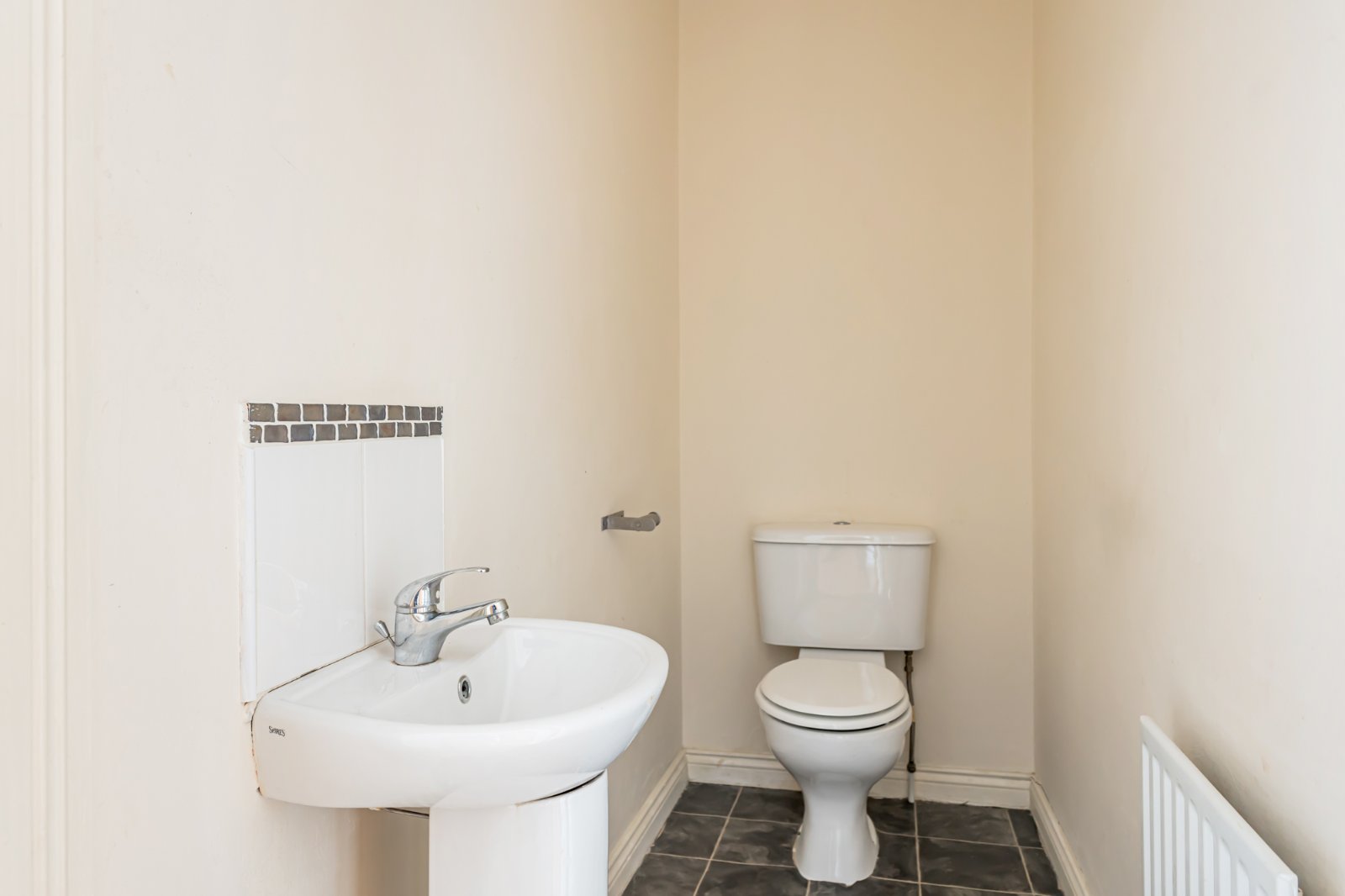 Two piece white suite comprising dual flush WC and pedestal wash hand basin with mixer tap and tiled splashback. Lino floor. Extractor fan.