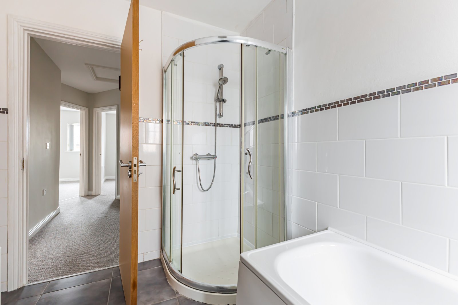 Contemporary four piece white suite comprising panel bath with mixer tap, fully tiled built in shower cubicle, thermostatically controlled shower unit, pedestal wash hand basin with mixer tap, dual flush WC, part tiled walls, ceramic tiled floor, extractor fan.