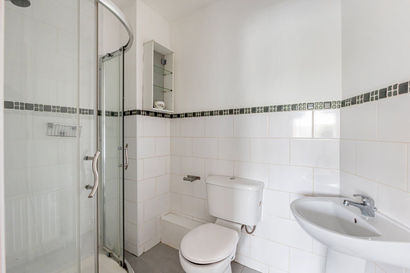 Contemporary white suite comprising fully tiled built in shower cubicle, thermostatically controlled shower unit, pedestal wash hand basin with mixer tap, dual flush WC, wash hand basin, ceramic tiled floor, extractor fan.