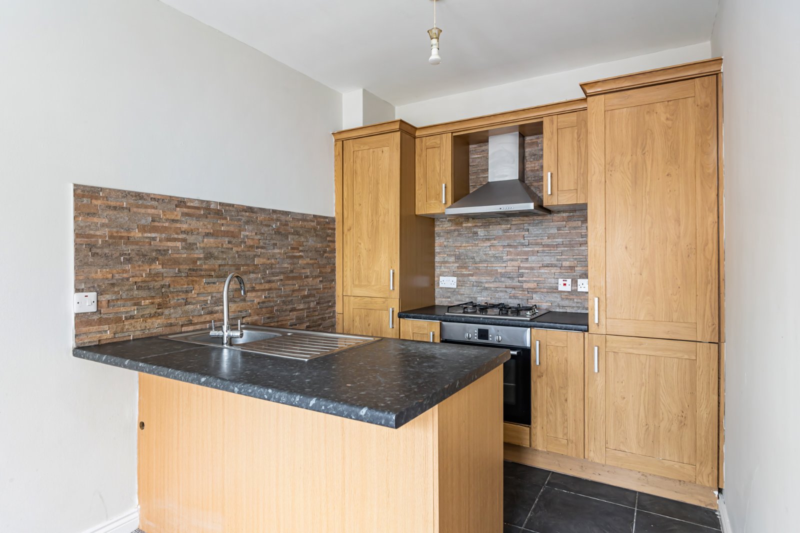 Stainless steel single drainer sink unit with mixer taps, excellent range of high and low-level units with rolled edge worktops. Built-in oven and four ring gas hob, stainless steel chimney extractor fan, plumbed for washing machine, integrated fridge freezer, part tiled walls, ceramic tiled floor, open to dining area with carpeted flooring.