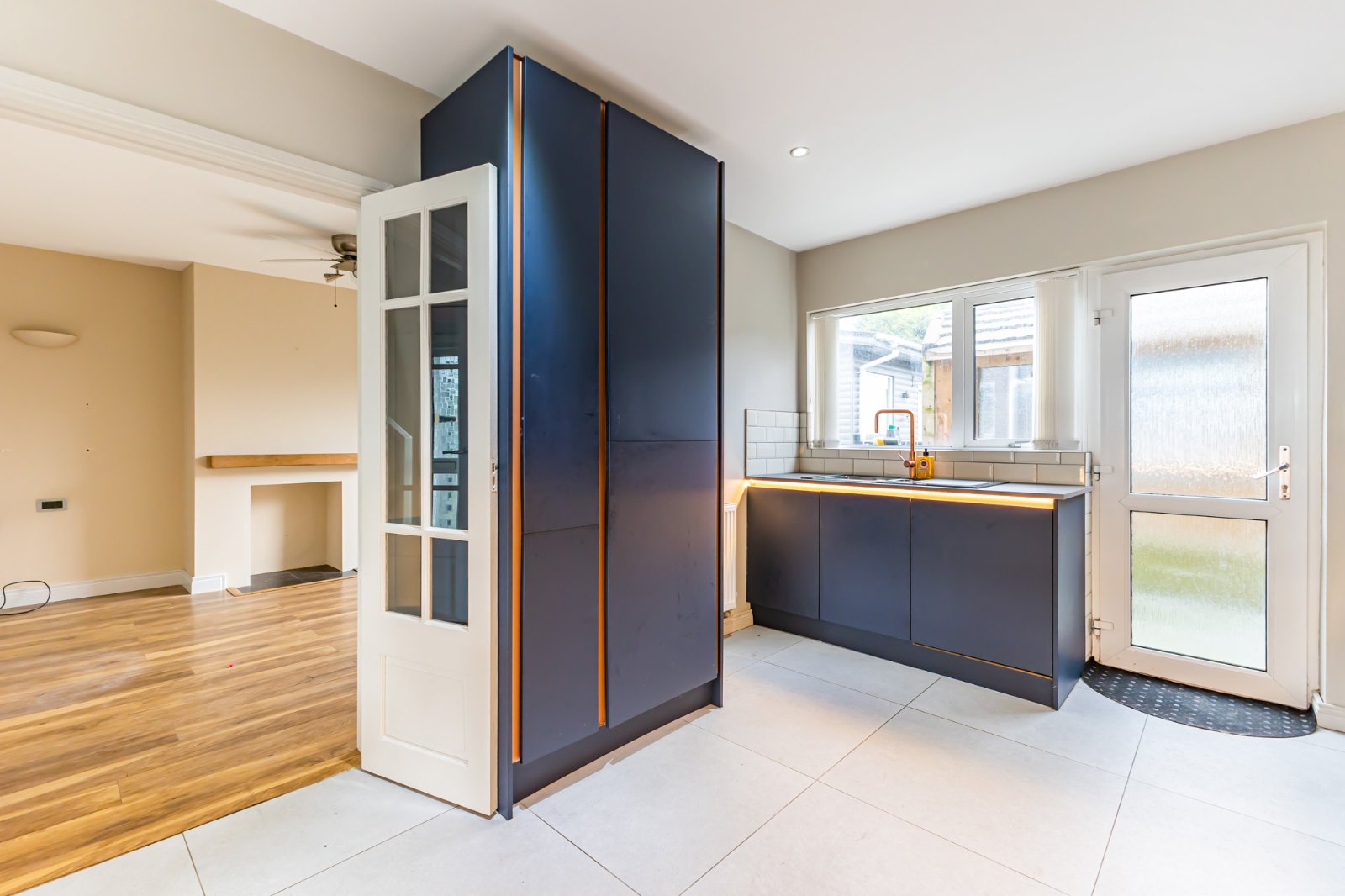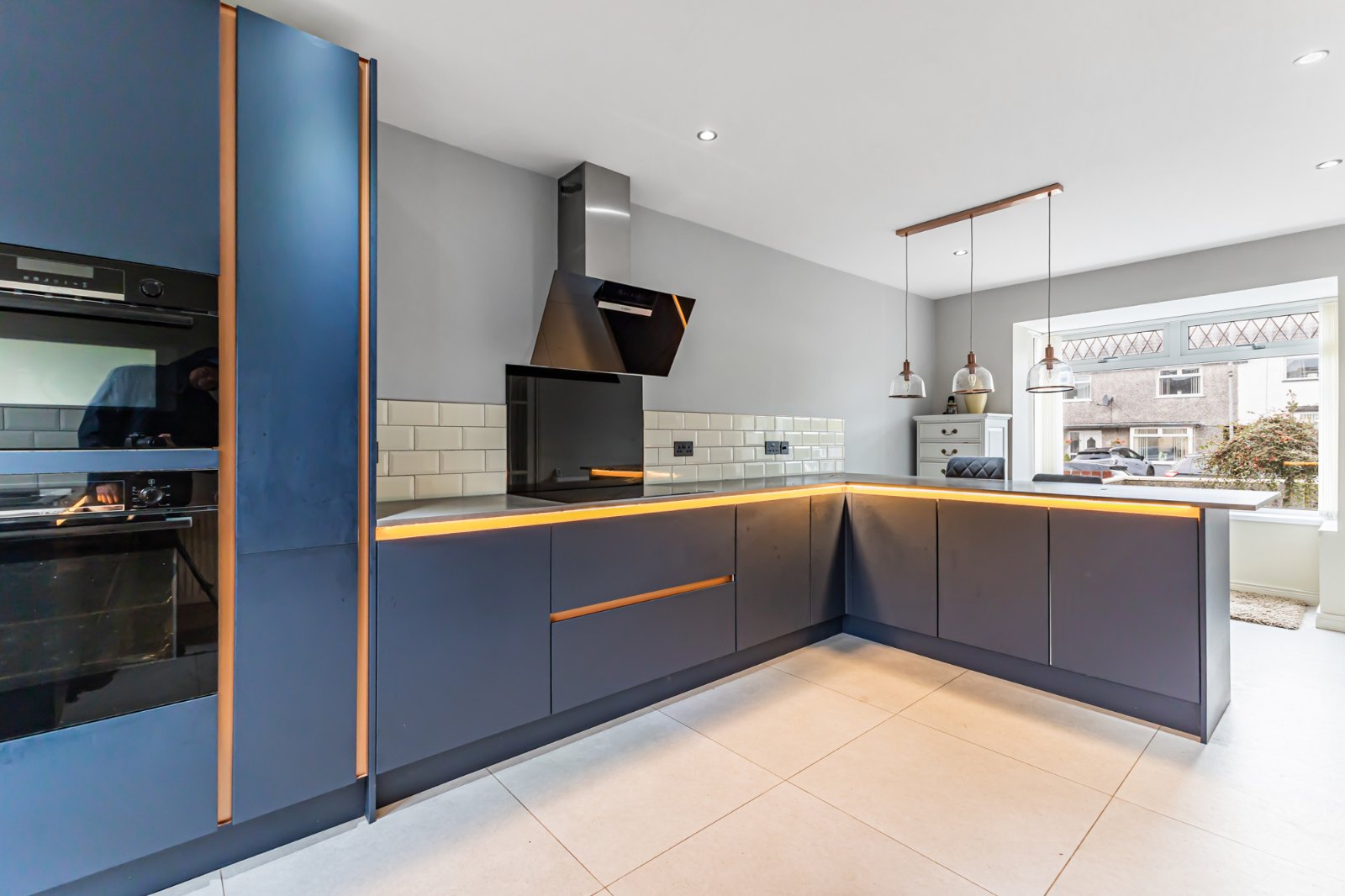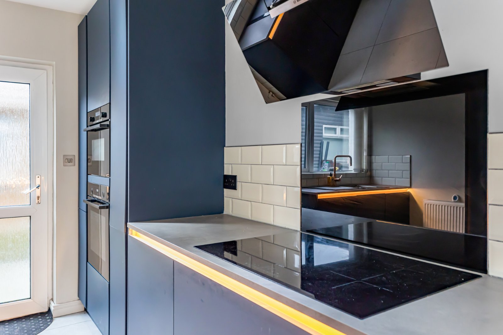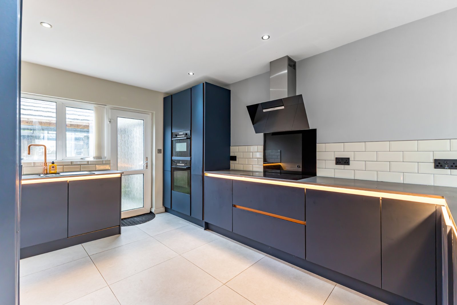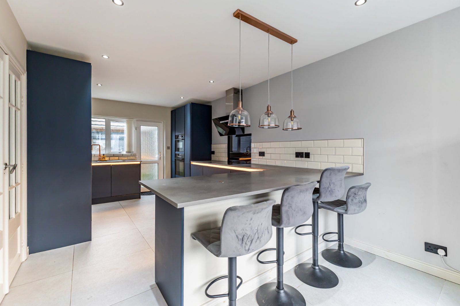 Modern fitted kitchen compromising: Stainless steel 1.5 drainer sink unit with mixer taps, excellent range of high and low level units, laminate work surfaces, built in double oven, 5 ring induction hob with glass splashback and BOSCH extractor fan, integrated fridge freezer and dishwasher, breakfast bar, partially tiled walls, ceramic tiled flooring, recess low voltage spotlights, UPVC double glazed door to gardens