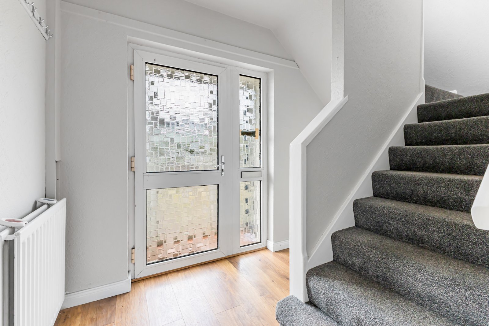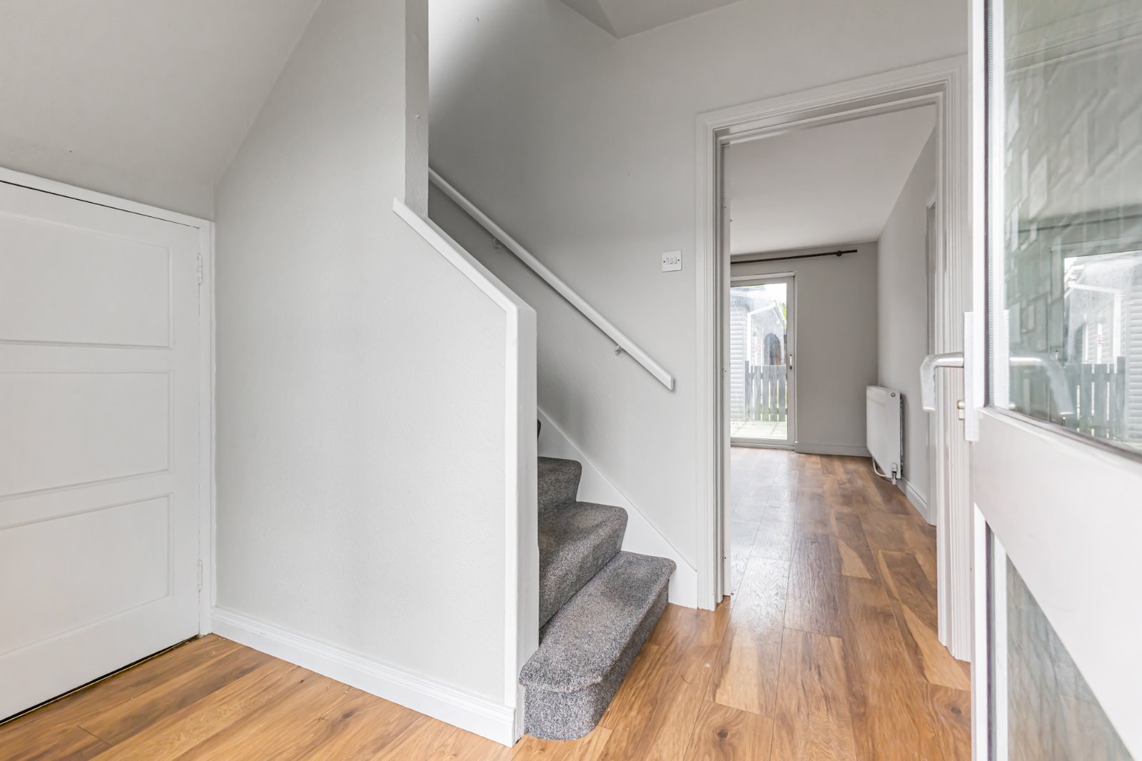 UPVC Double glazed front door, laminate wooden flooring, understairs storage cupboard leading to