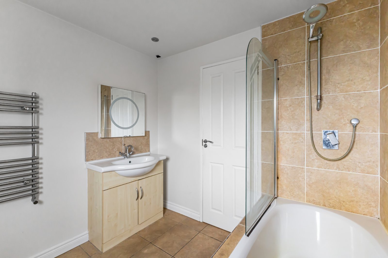Modern white suite compromising: Tiled bath with mixer taps and thermostatically controlled shower unit, vanity sink unit with mixer taps, dual flush WC, ceramic tiled floor, partially tiled walls and recess low voltage spot lights