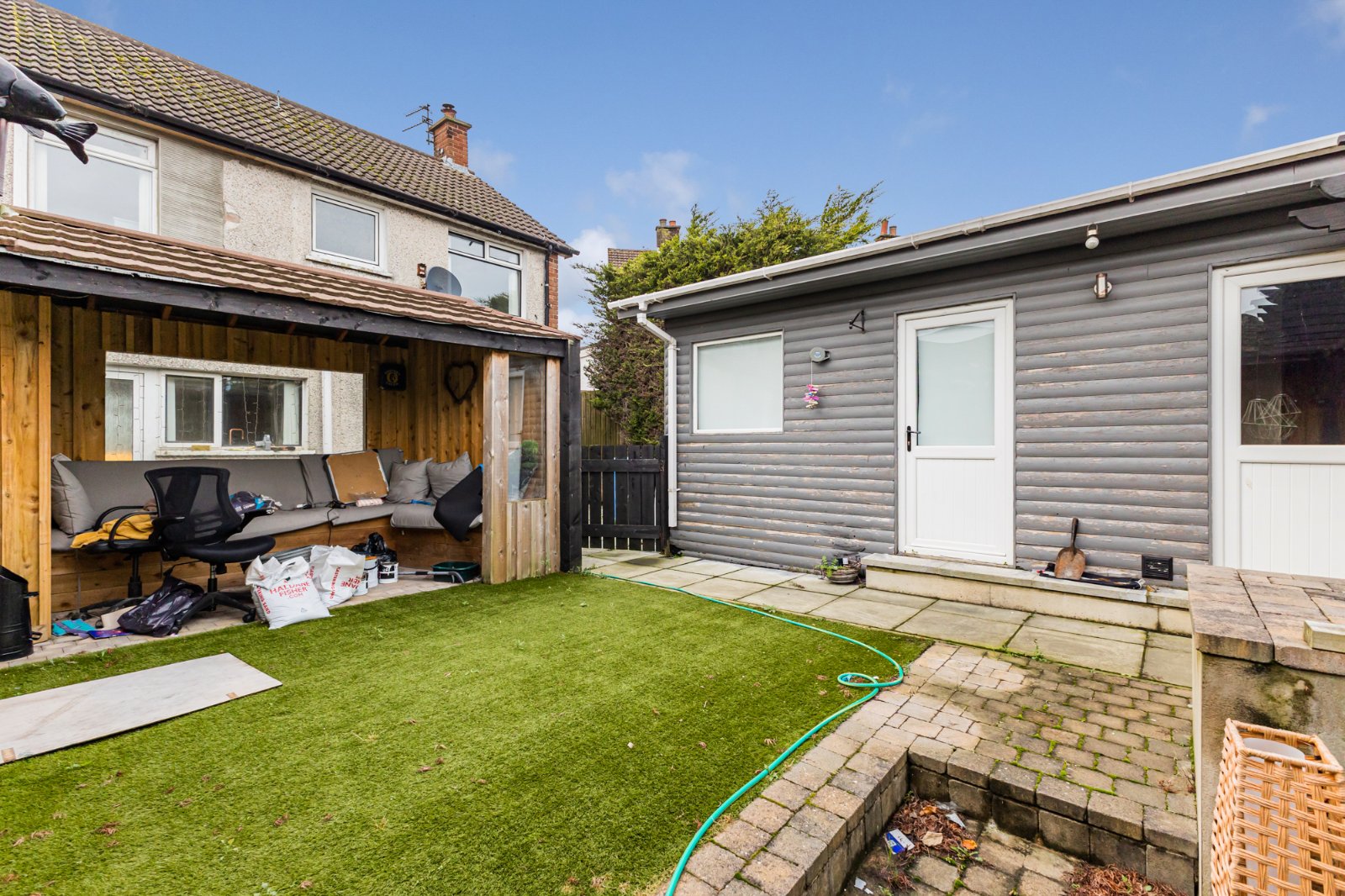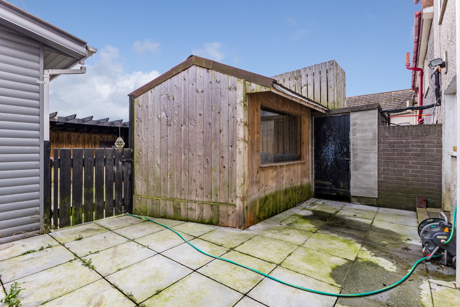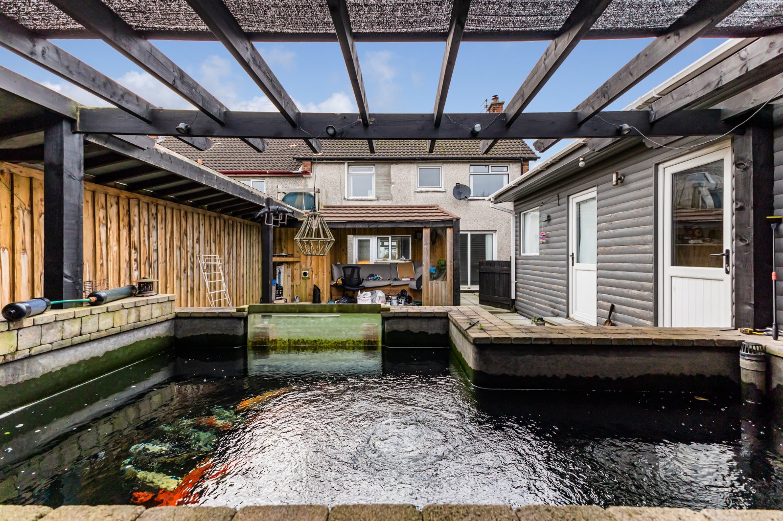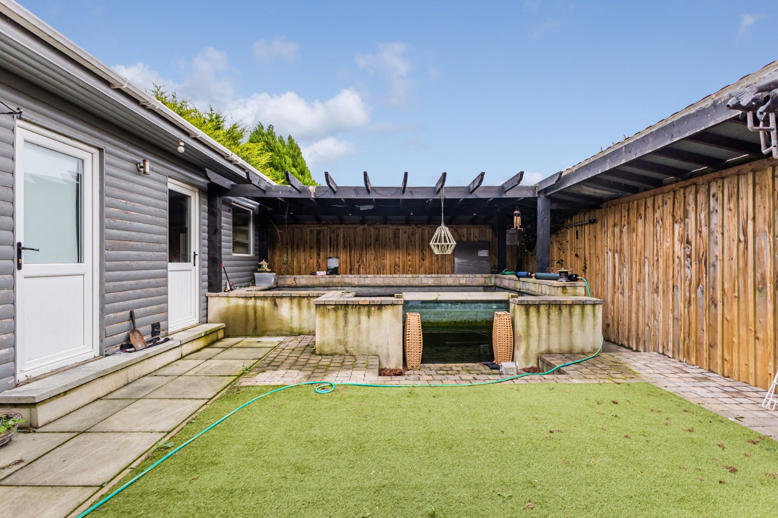 Enclosed rear patio in paving, additional enclosed gardens in artificial grass, range of outbuildings, oil fired boiler, PVC oil tank and coy pond