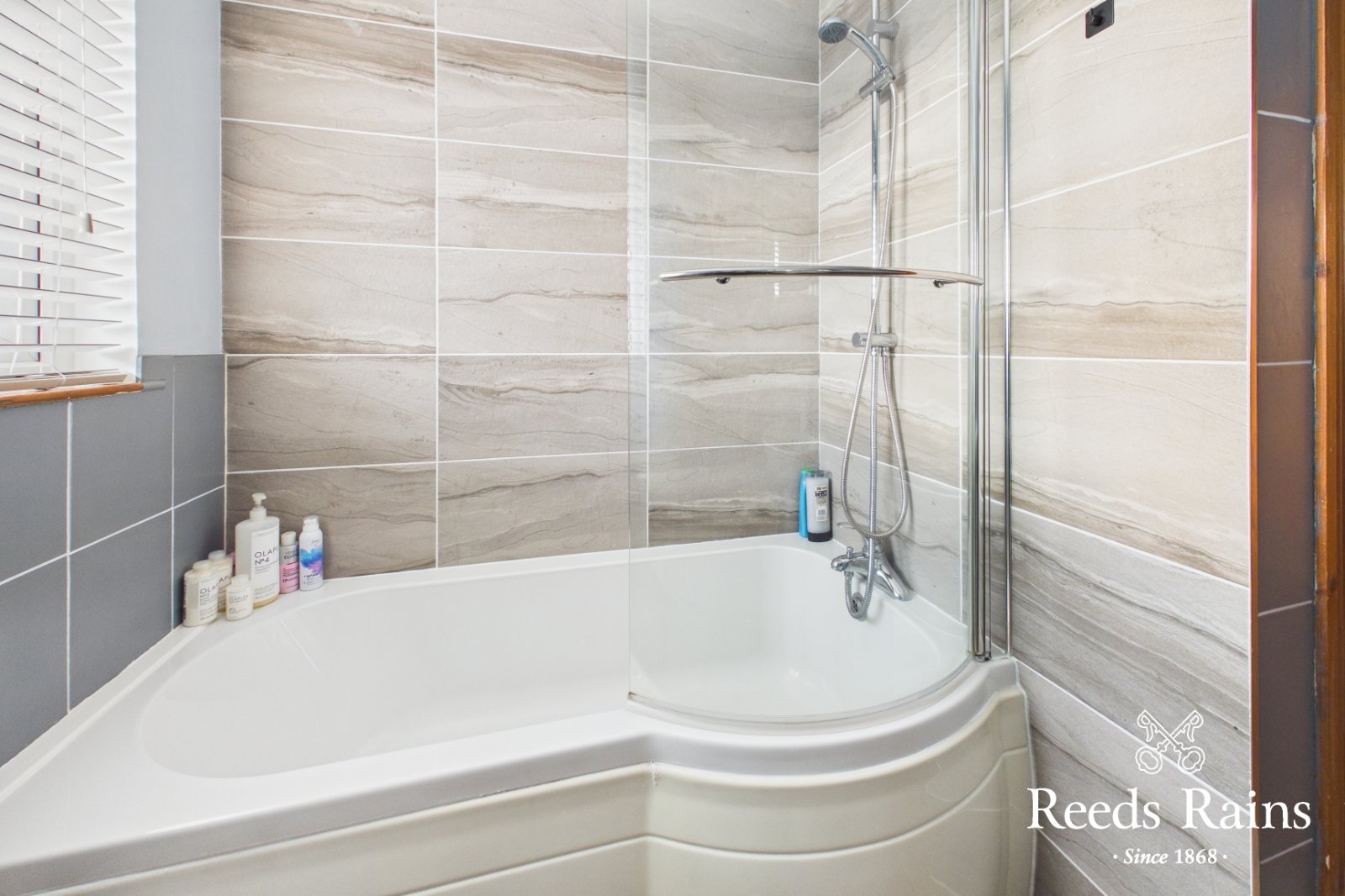Modern white suite comprising: Panelled bath with mixer taps, telephone hand shower and Rain shower, pedestal wash hand basin, dual flush WC, stainless steel heated towel rail, part tiled walls, airing cupboard.