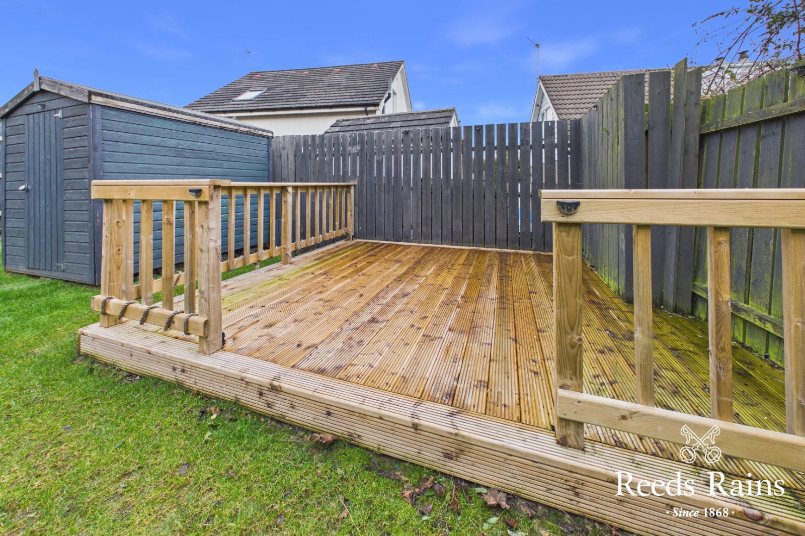 Enclosed rear gardens in lawns and paved patio area with feature decking. Garden shed, outside tap and light.