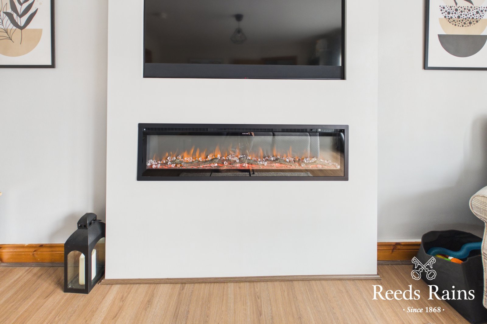 Laminate wooden floor, feature wall mounted electric fire and Media wall, Glazed double doors to kitchen.