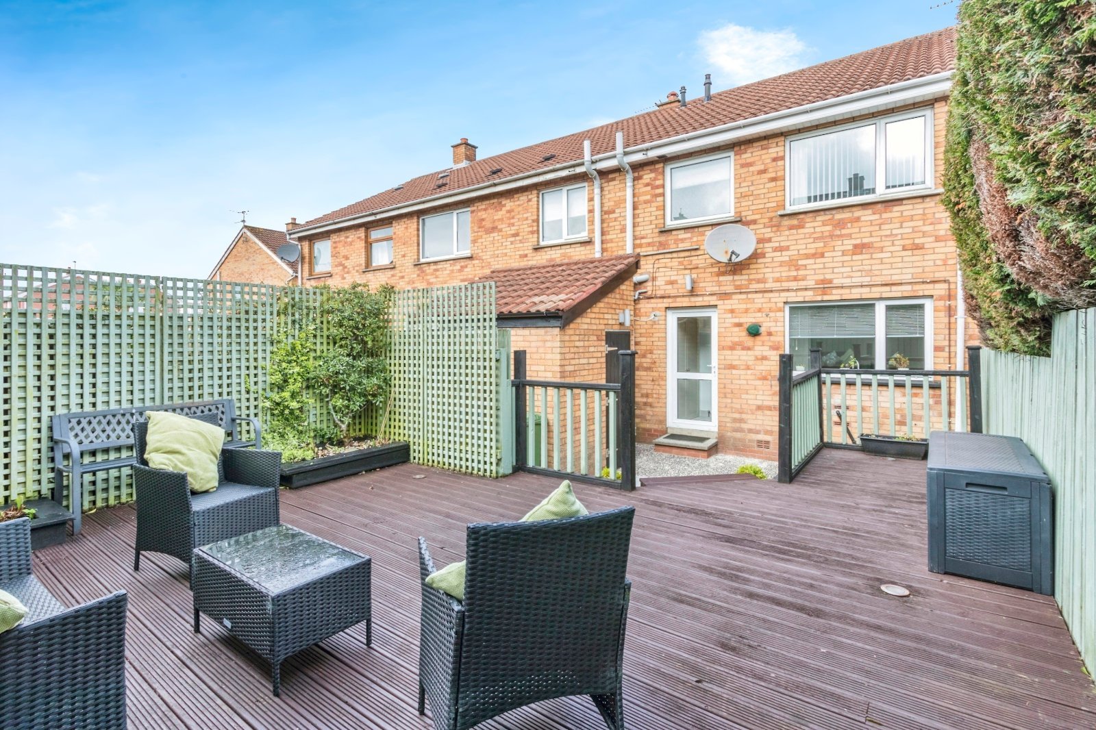 Enclosed rear garden in paved patio and feature decking. Outside tap and light.