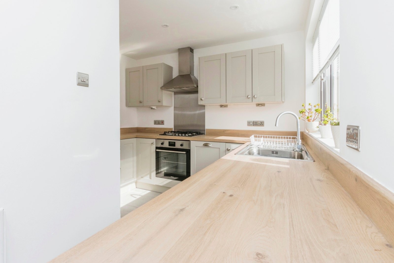 Single drainer stainless steel sink unit with mixer taps, excellent range of high and low level units with laminated work surfaces, built in oven and 4 ring gas hob, stainless steel splashback and chimney extractor fan, integrated fridge, integrated dishwasher, larder cupboard, plumbed for washing machine, ceramic tiled floor, recessed spotlights,, uPVC double glazed door to rear garden.
