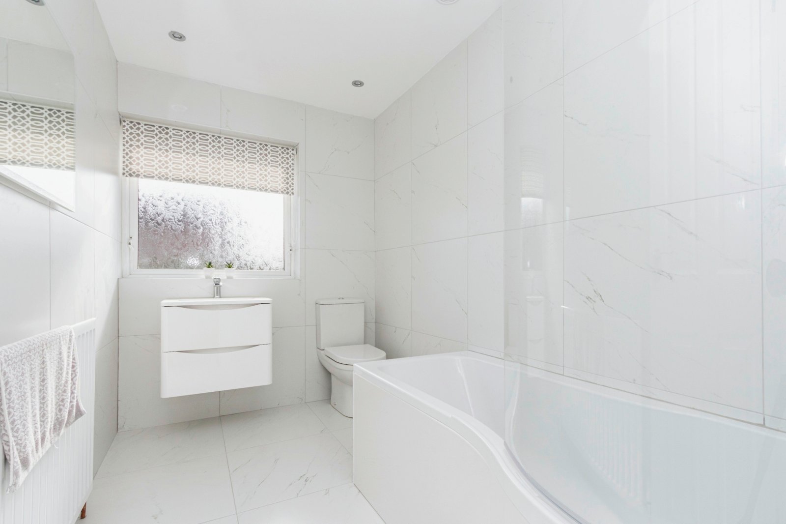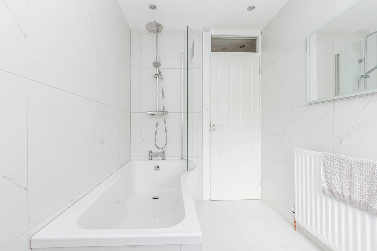 Modern white suite comprising: Panelled bath with mixer taps, telephone hand shower and Rain shower. Dual flush WC, vanity unit with mixer taps, fully tiled walls, ceramic tiled floor, recessed spotlights.