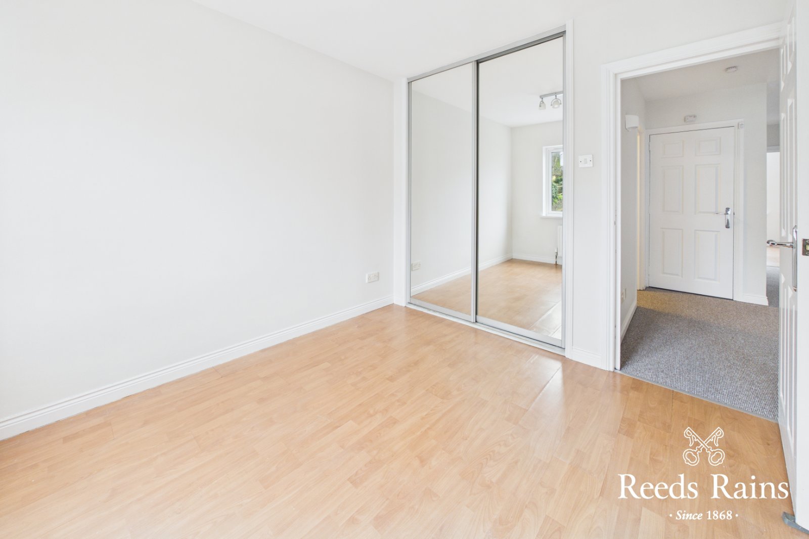 Built in double wardrobe with mirrored sliding doors. Laminate wood floor.