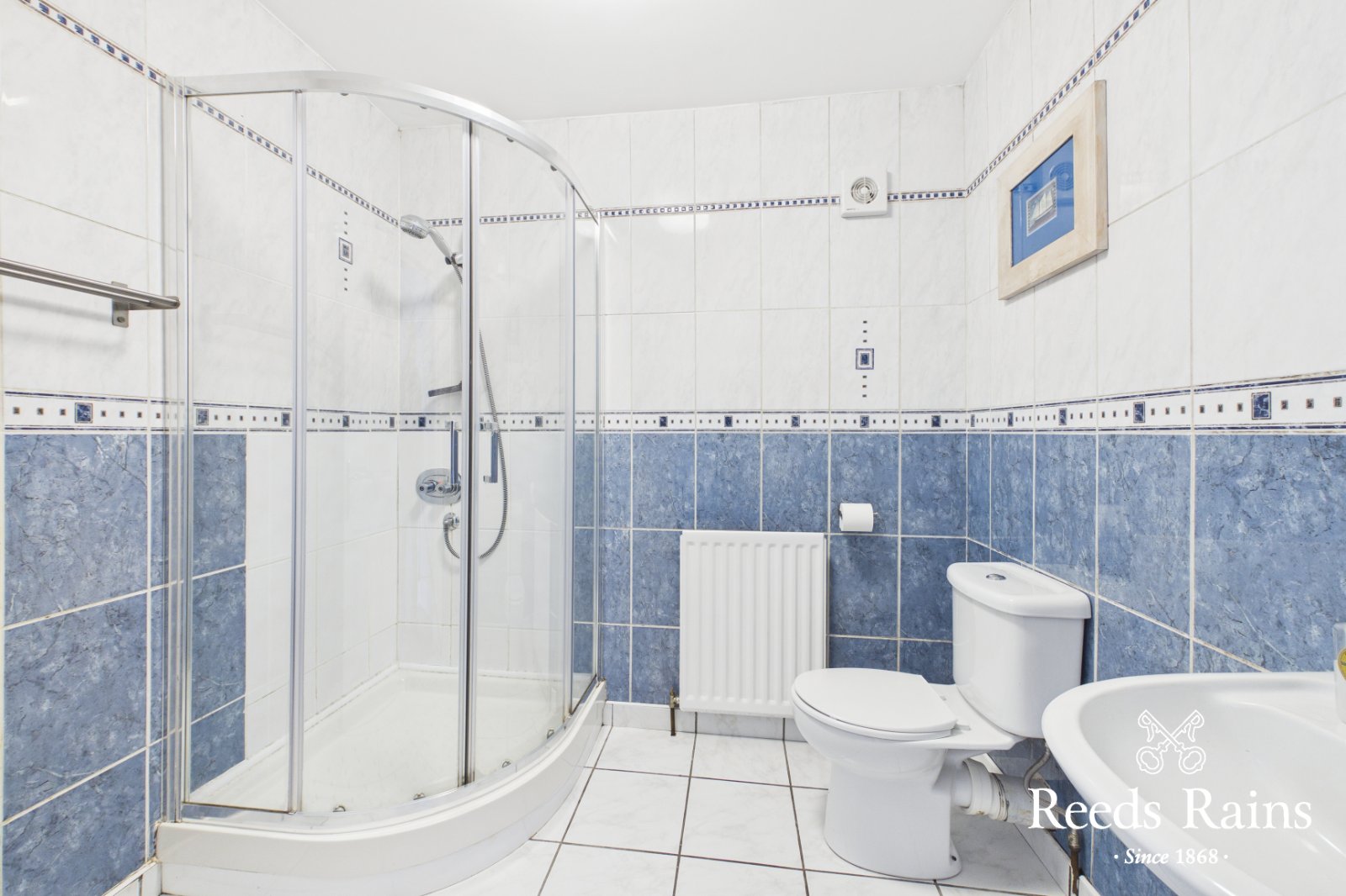 Three piece white suite comprising: Fully tiled enclosed shower cubicle with thermostatically controlled shower unit, Dual flush WC, and pedestal wash hand basin with mixer tap. Tiled floor and fully tiled walls, extractor fan.