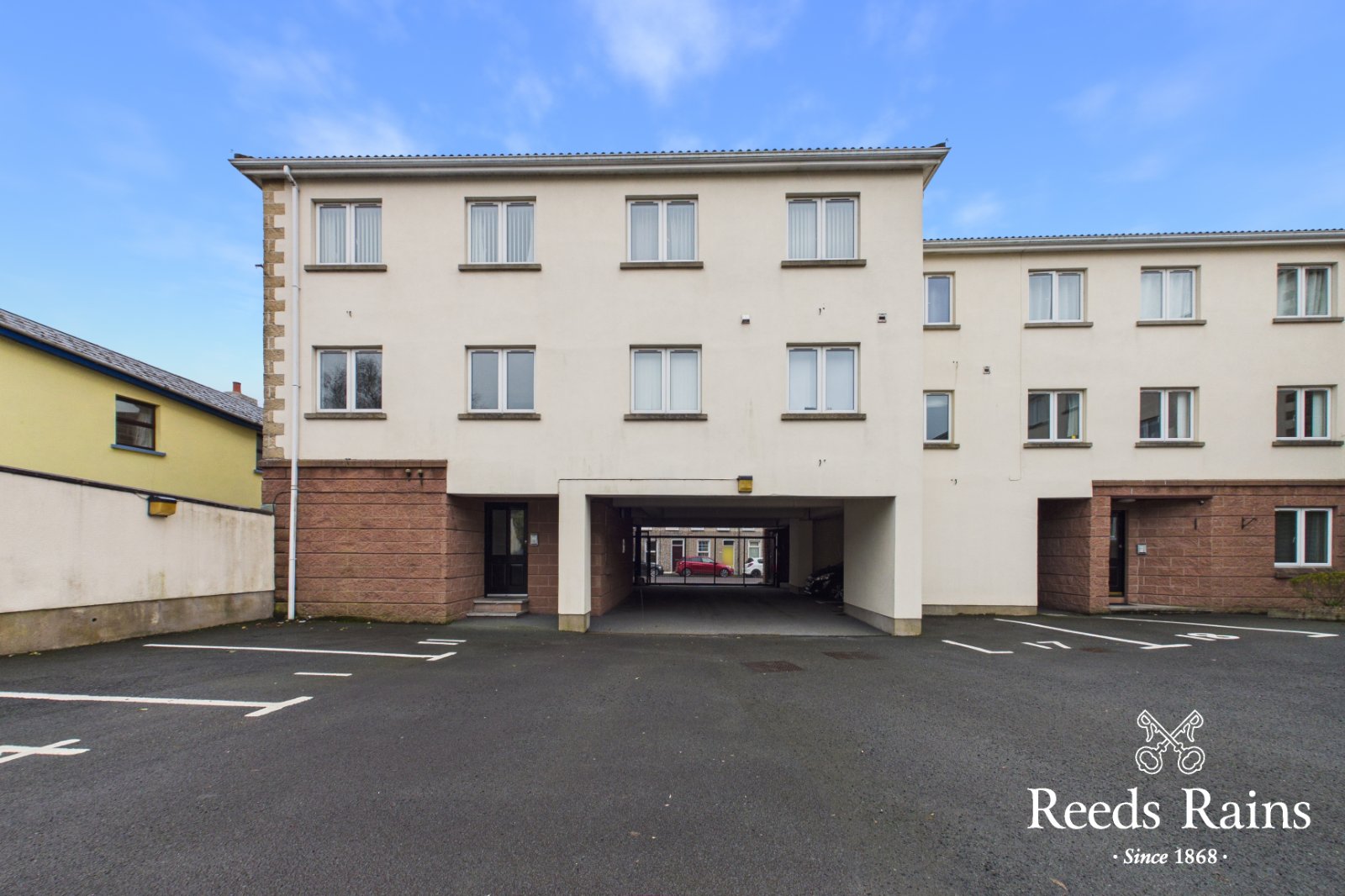 Electric entrance gates leading to 1 designated car parking space and additional visitors parking.