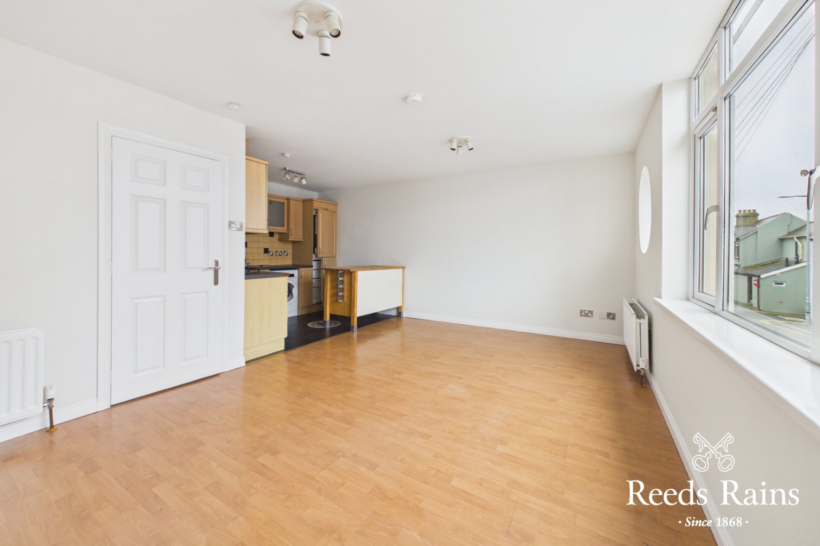 Internally, the accommodation is well laid out and comprises two well-proportioned bedrooms, a shower room with modern white suite, and a fitted kitchen with a range of integrated appliances. The kitchen is open plan to a bright and comfortable living area, creating a practical and sociable living space well suited to modern lifestyles.