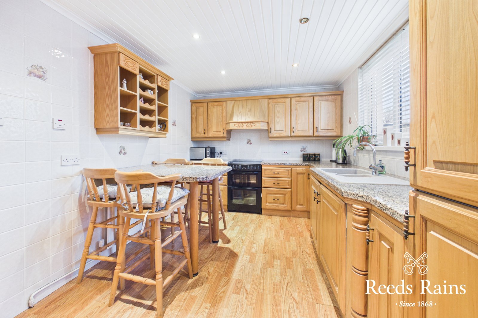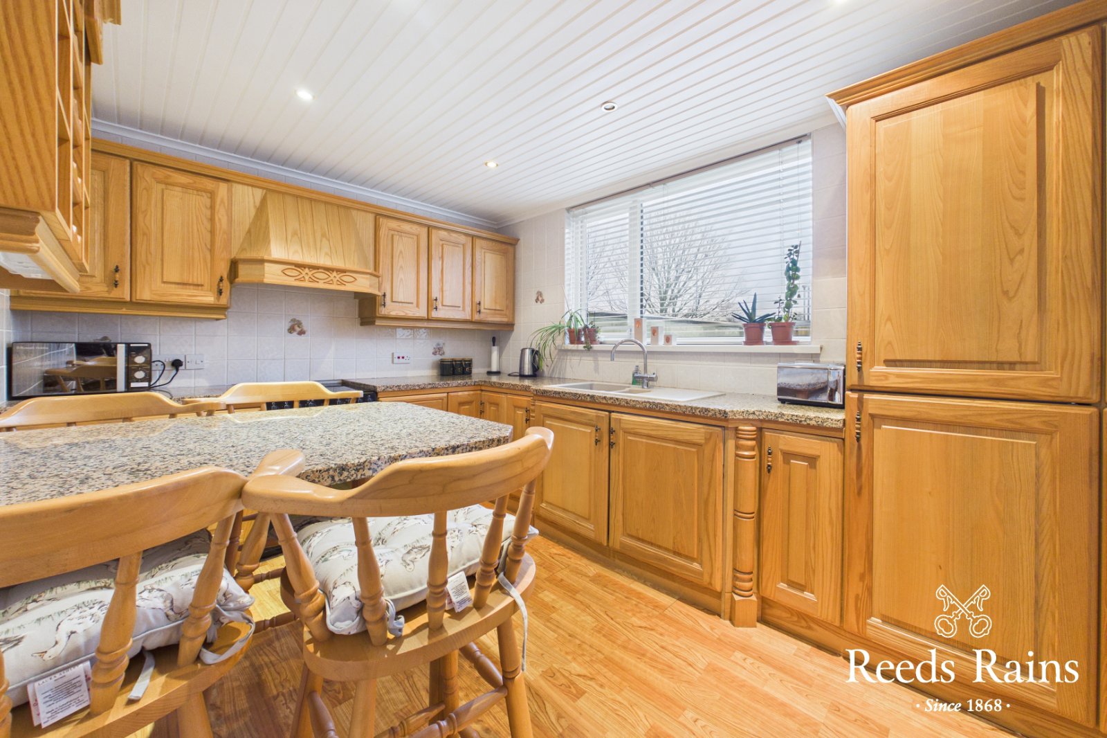 Single drainer 1.5 composite sink unit with mixer taps, excellent range of high and low level units with laminated work surfaces, cooker space, extractor fan and canopy, integrated fridge-freezer, integrated washer / dryer, fully tiled walls, tongue and groove ceiling with recessed spotlights.