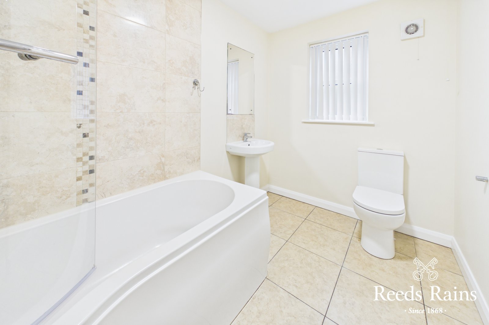Modern white suite comprising: Panelled bath with mixer taps and thermostatically controlled shower unit, pedestal wash hand basin with tiled splashback, dual flush WC, ceramic tiled floor, extractor fan.
