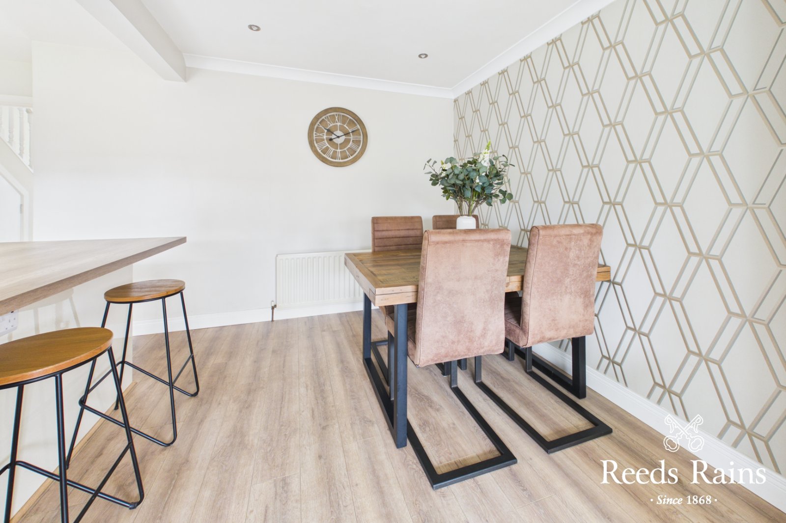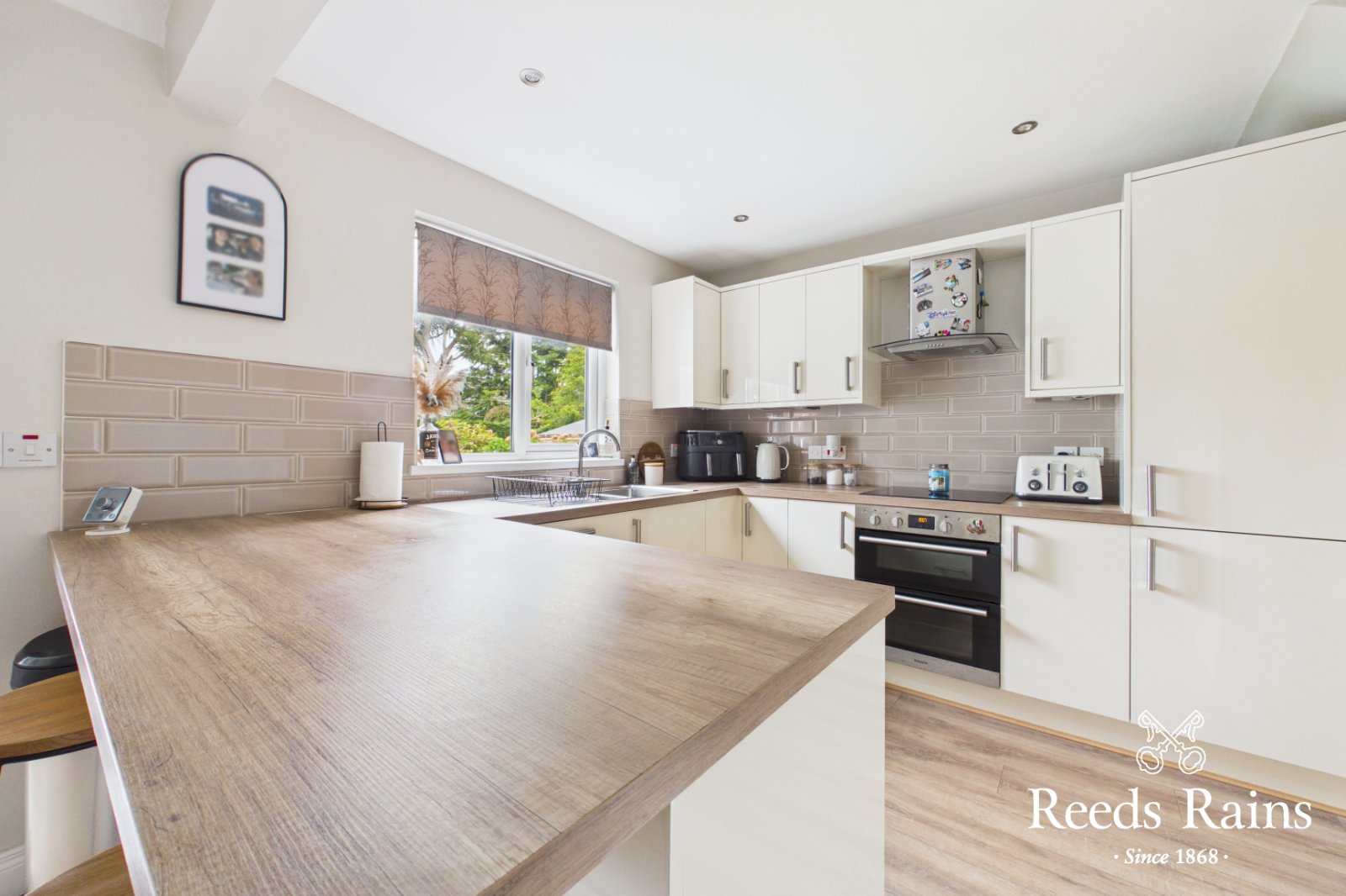 The ground floor comprises a spacious lounge, creating a comfortable and inviting setting for relaxation. To the rear, a contemporary fitted kitchen with breakfast bar seamlessly flows into a dining area, which in turn opens into a bright sunroom-forming an excellent open-plan arrangement ideal for both everyday living and entertaining.