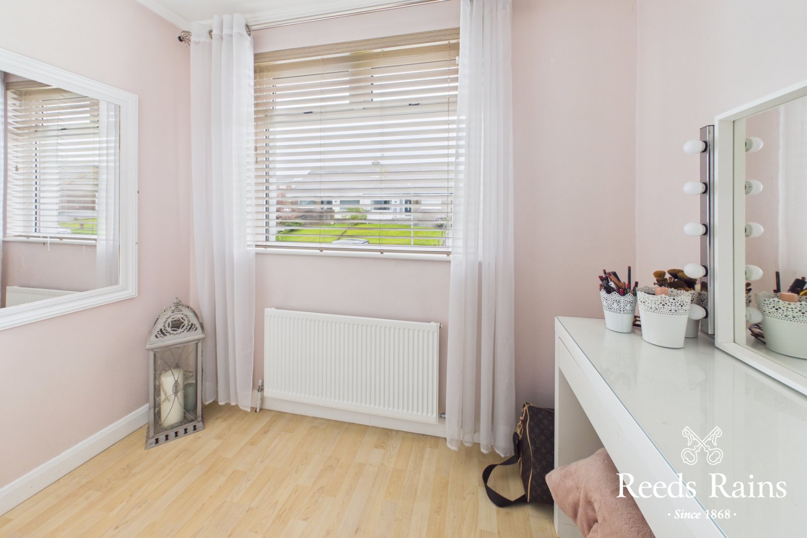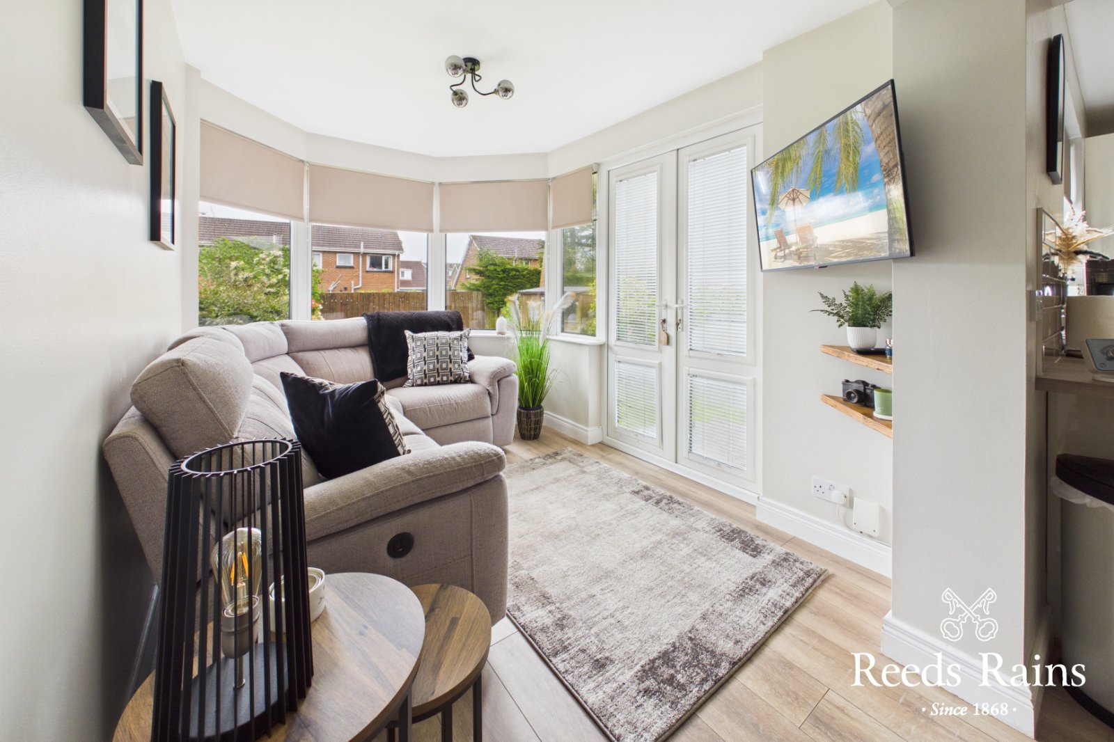 Laminate wooden floor, uPVC double glazed French doors to rear garden.