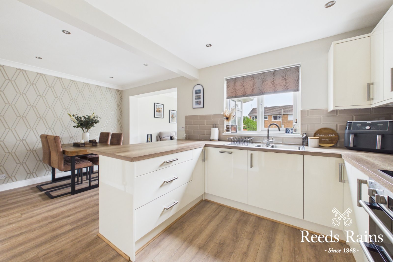 Single drainer 1.5 stainless steel sink unit with mixer taps, excellent range of high and low level units with laminated work surfaces, breakfast bar, built in double oven and 4 ring ceramic hob, stainless steel chimney extractor fan, integrated fridge freezer, integrated dishwasher, part tiled walls, recessed spotlights, laminate wooden floor,. Open plan to Dining area which is open plan to sun room.