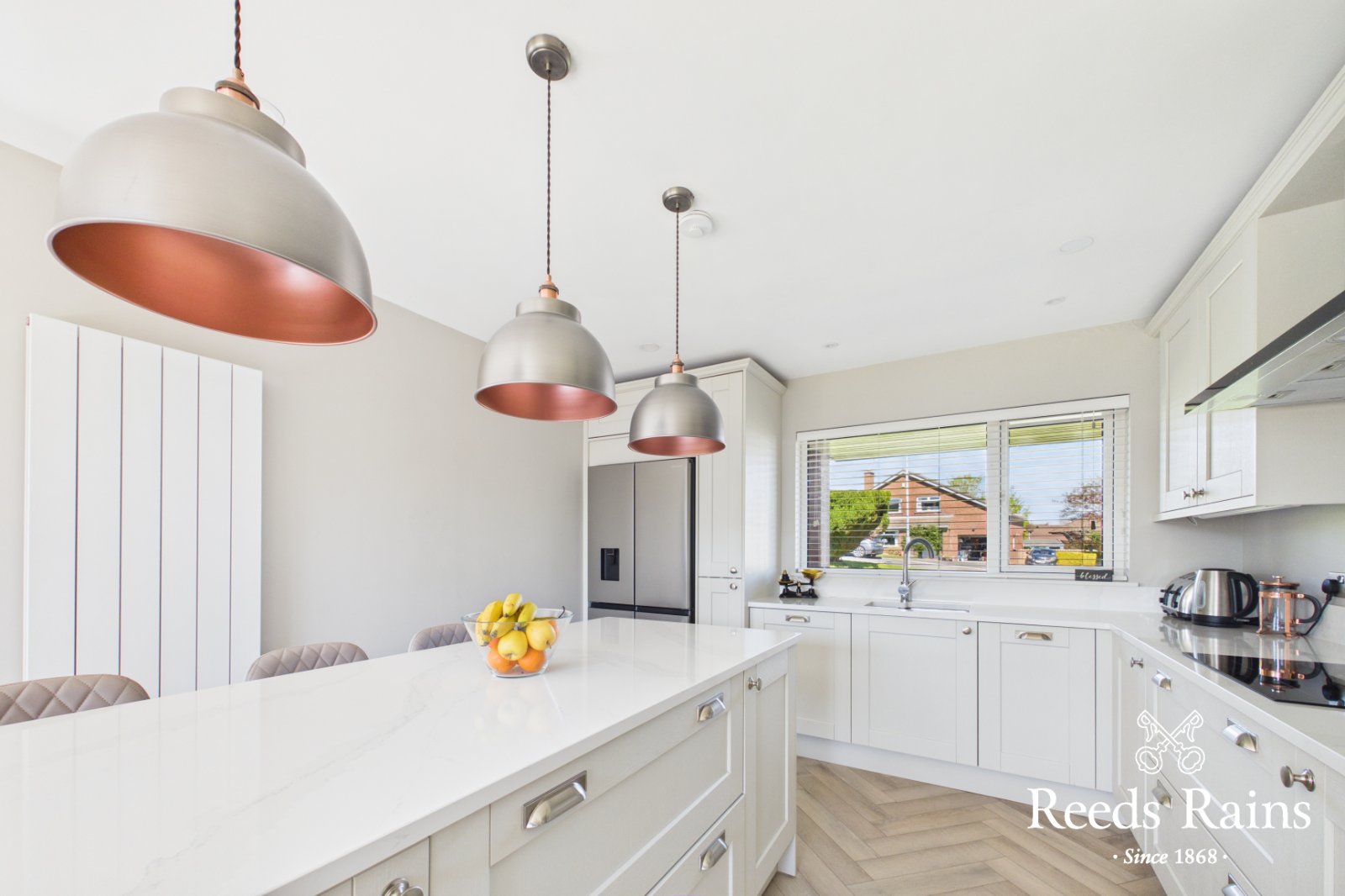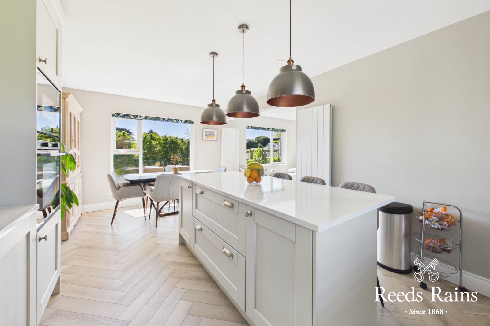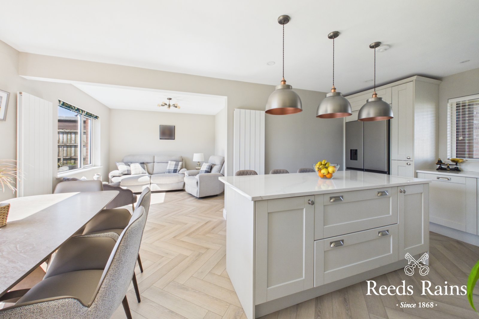 Inset 1.5 stainless steel sink unit Quartz drainer and work surfaces, excellent range of high and low level units with quartz upstands , built in oven and 4 ring ceramic hob, stainless steel chimney extractor fan, integrated microwave, integrated dishwasher, central island /breakfast bar, recessed spotlights, laminate wooden floor. Open plan to Dining area, connecting door to garage.