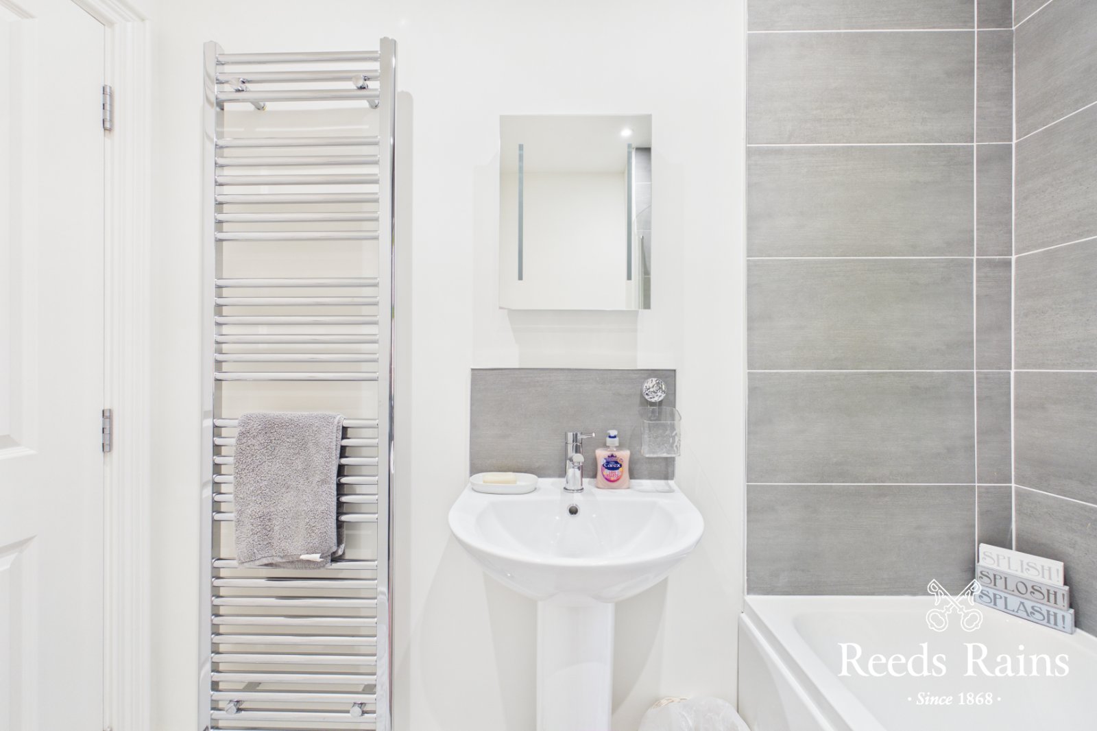 Modern white suite comprising: Panelled bath with mixer taps and telephone hand shower, pedestal wash hand basin with tiled splashback, dual flush WC, ceramic tiled floor, part tiled walls, recessed spotlights and extractor fan.
