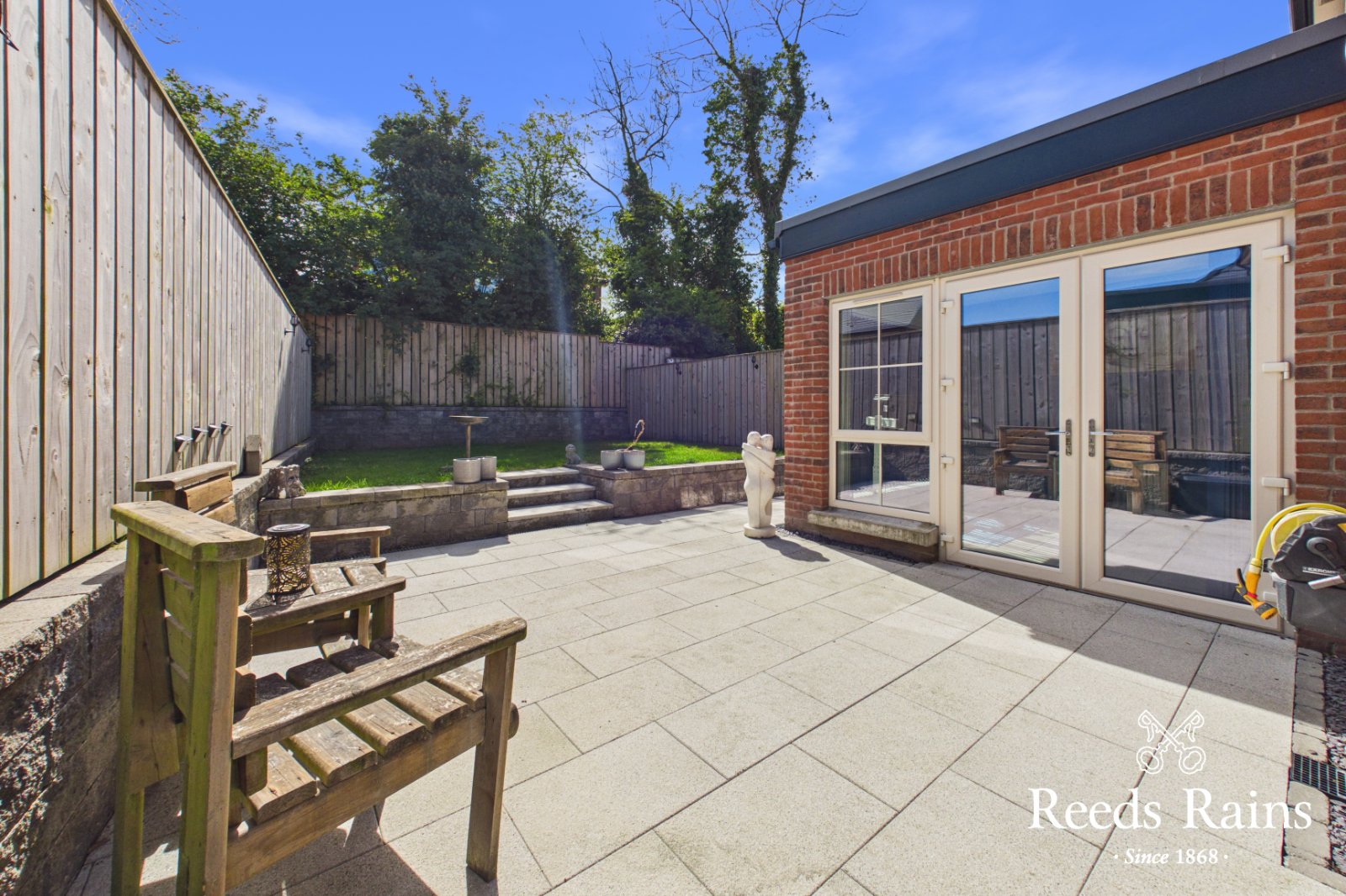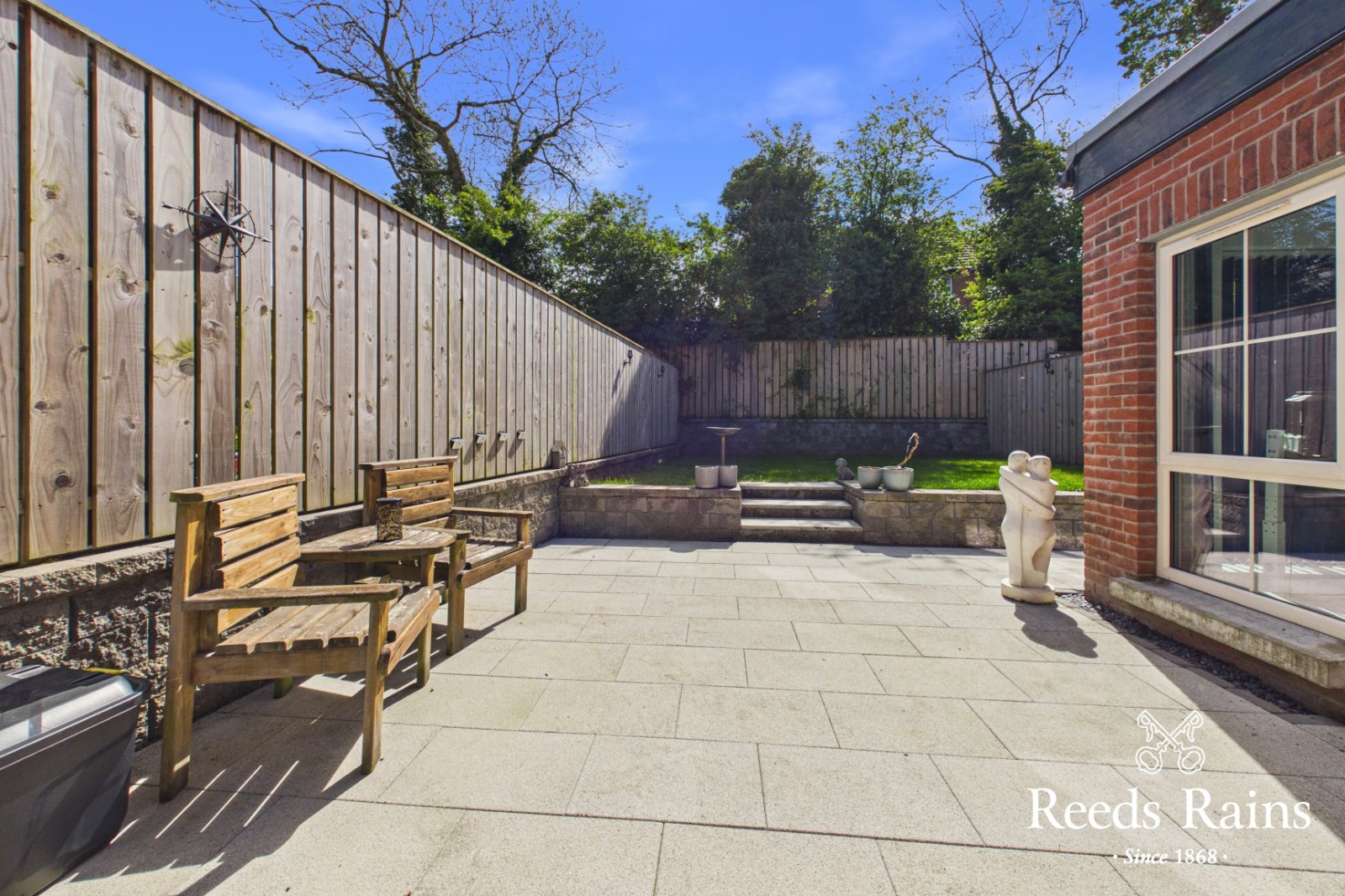Private enclosed South facing rear garden in lawns, paved patio area and walkways. External power sockets, tap and light.