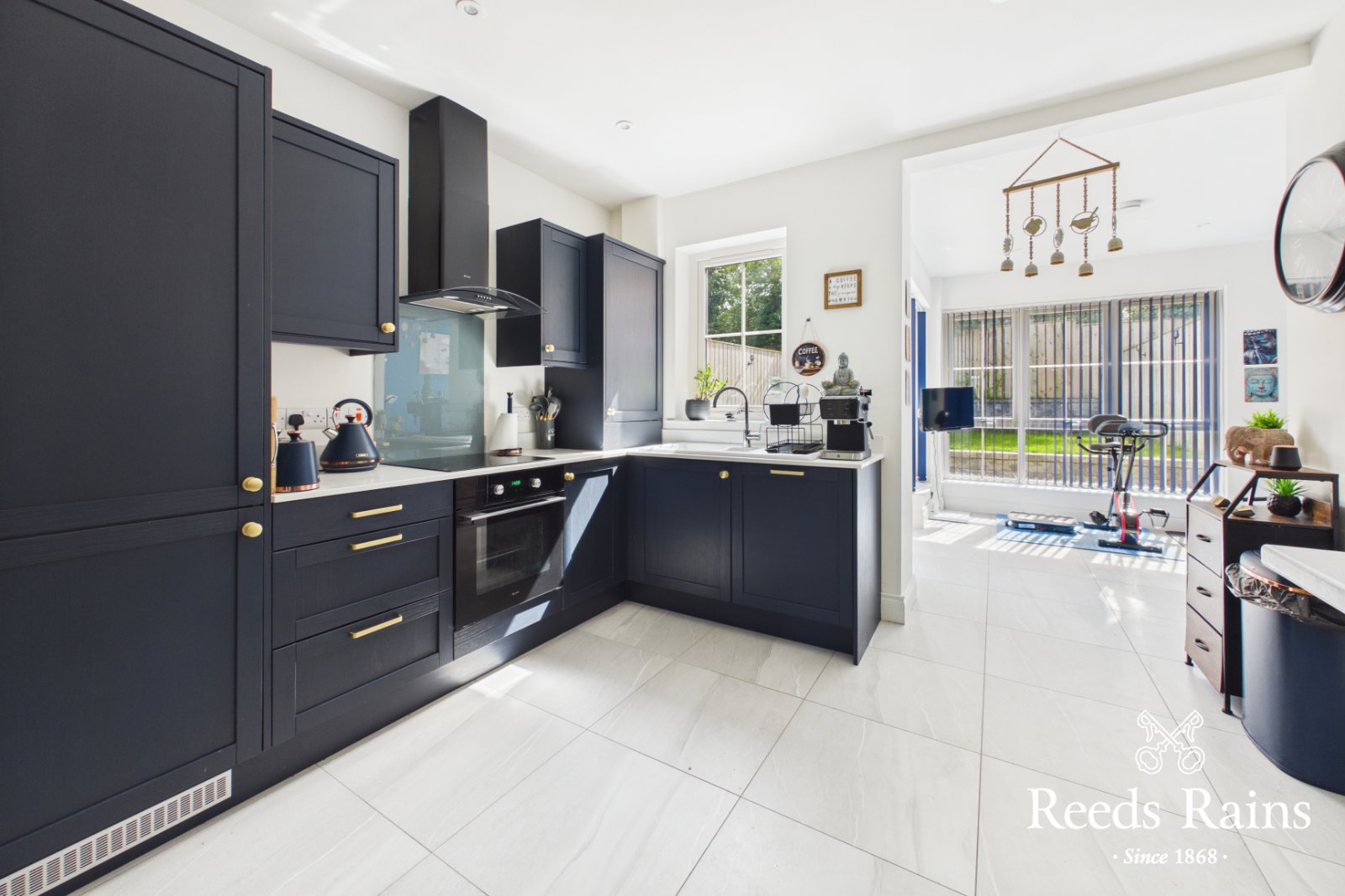 Single drainer ceramic sink unit with mixer taps, excellent range of high and low level units with Quartz worktops and upstands, built in oven and 4 ring ceramic hob, glass splashback, chimney extractor fan, integrated fridge freezer, integrated dishwasher, gas boiler, breakfast bar, recessed spotlights, ceramic tiled floor,. Open plan to sun room.