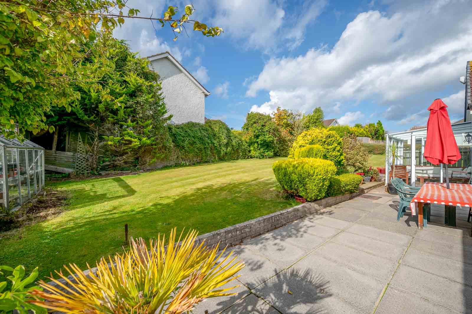 Side garden in lawns, outstanding rear garden with lawns, extensive paved patio barbecue terrace, flowerbeds in plants and shrubs, uPVC oil tank, outside tap, excellent degree of westerly aspect making ideal space for children at play, outdoor entertaining or enjoying the sun.