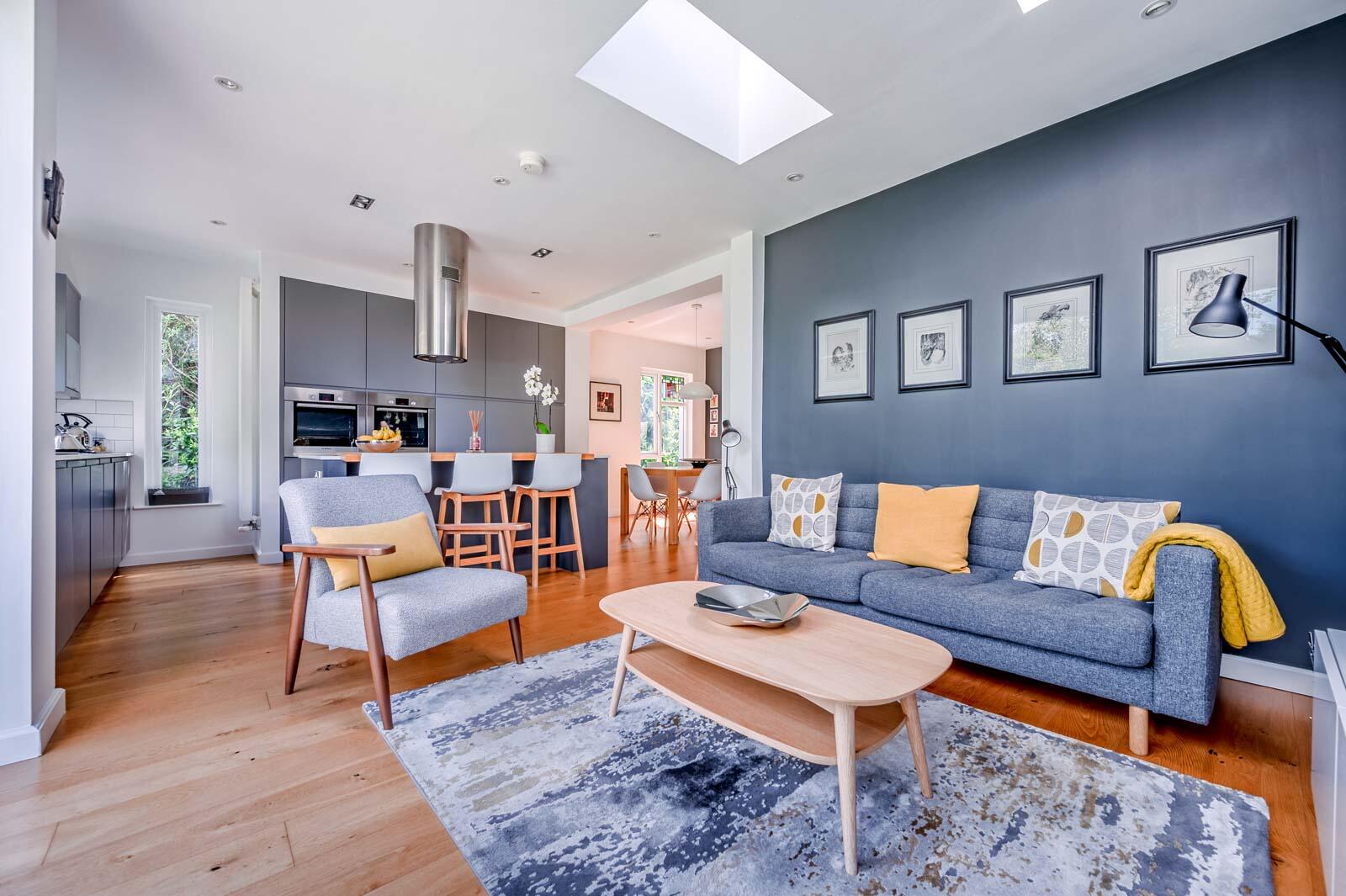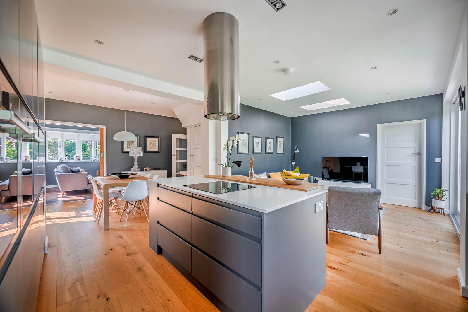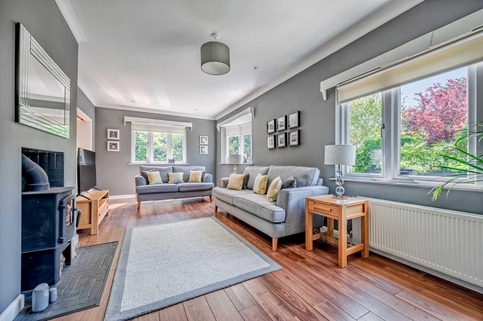 The accommodation is bright, spacious and flexible, particularly on the ground floor, which centres around a magnificent modern fitted kitchen open plan to a casual dining/family area. The kitchen boasts stylish units, quartz worktops, solid oak flooring, integrated appliances, a large island, and sliding patio doors to the rear garden. There is also a spacious living room with walnut flooring and a cast iron wood-burning stove.