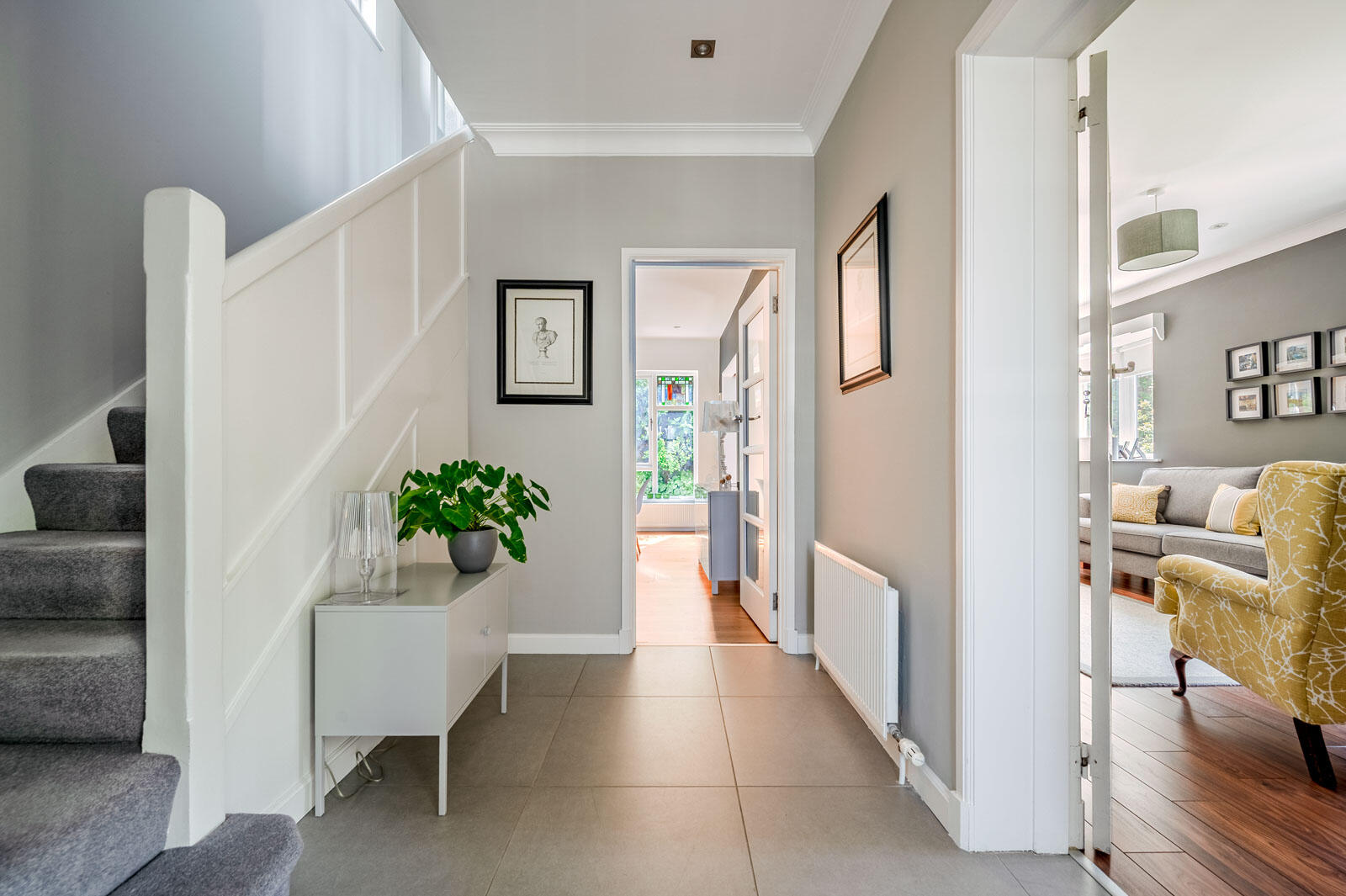 Fully tiled floor, cornice ceiling, cloakroom area.