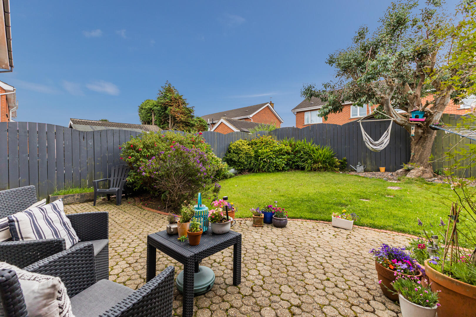 Outstanding Fully Enclosed Rear Garden with Lawns, Flowerbeds in Plants and Shrubs and Paved Patio Barbecue Area