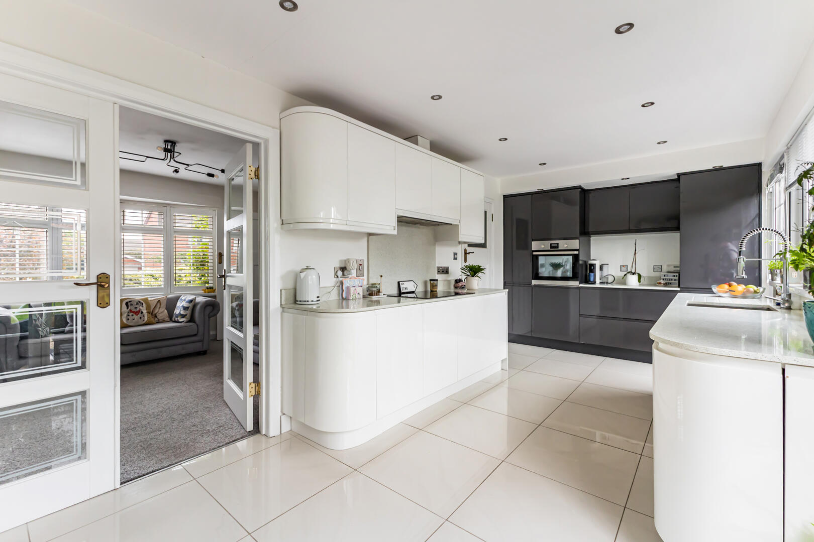 Range of high and low level high gloss units, quartz work surfaces, Smeg single bowl stainless steel sink unit, matching quartz drainer and mixer tap, integrated oven, integrated four ring hob, quartz splashback, integrated fridge freezer, integrated dishwasher, fully tiled floor, uPVC double glazed French doors to rear garden, additional double glazed door to rear garden.