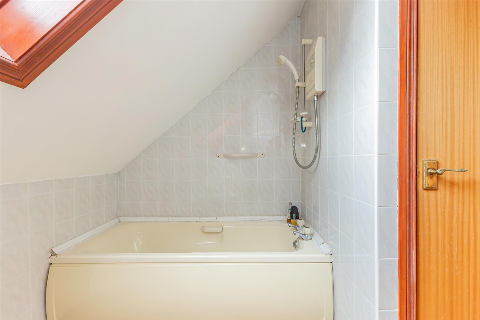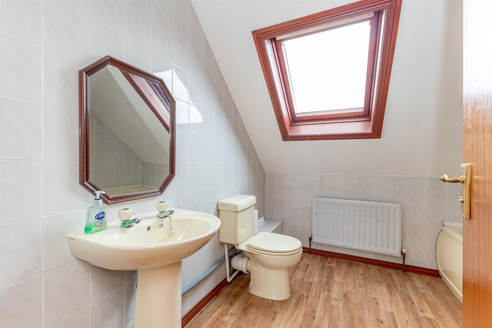 Coloured suite comprising panelled bath with electric shower unit over, low flush WC, pedestal wash hand basin, Velux, laminate wood flooring, hotpress with lagged copper cylinder and built-in shelving.