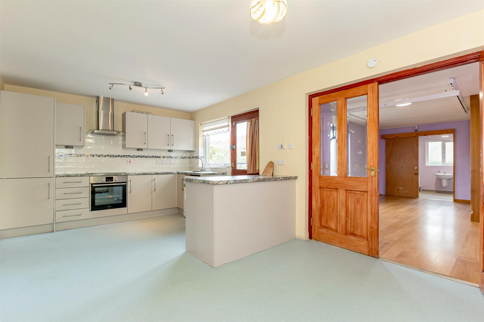 With range of high and low level units, laminate work surfaces, integrated electric oven with four ring ceramic hob, part tiled walls, stainless steel and glass extractor fan above, stainless steel splashback, mahogany door to garden.